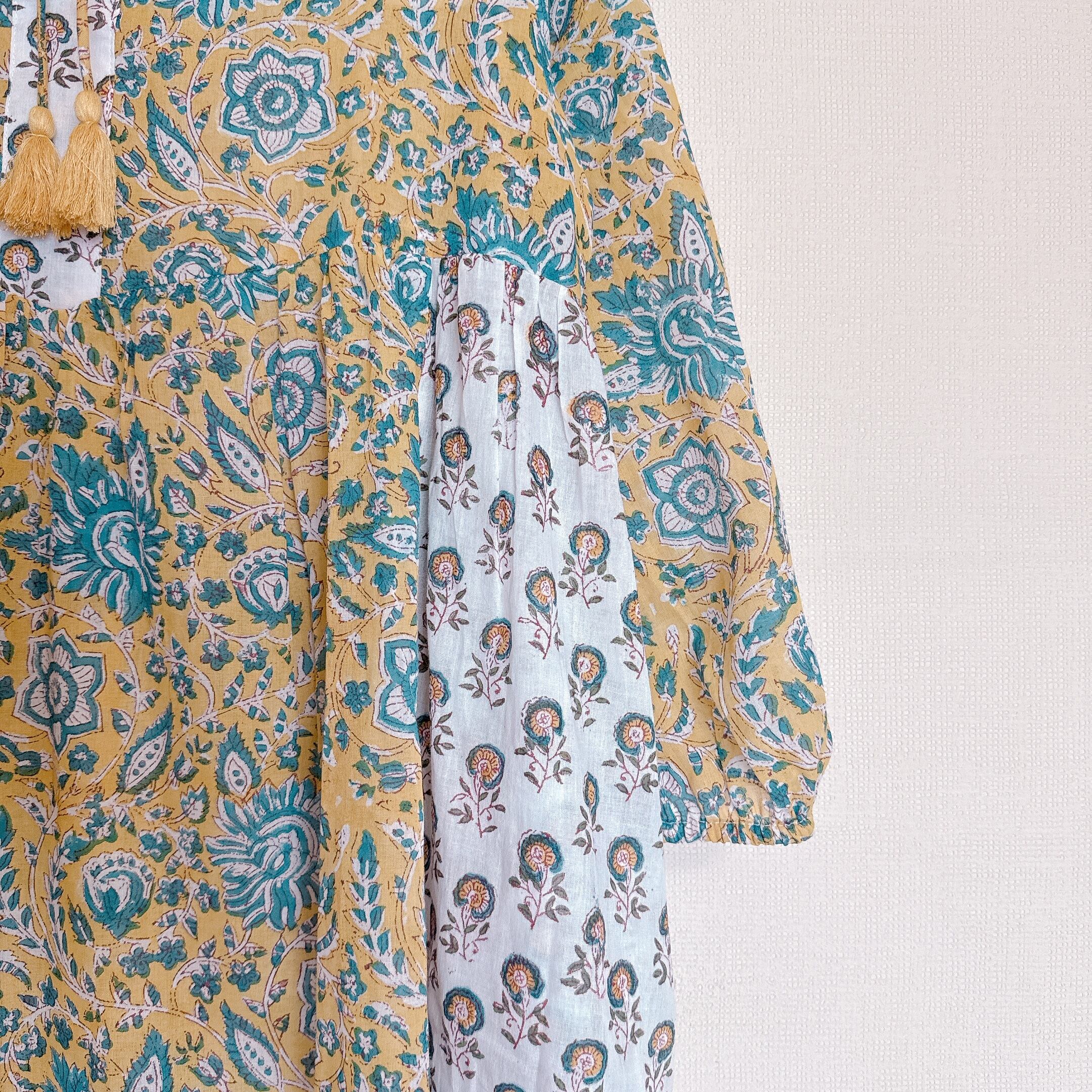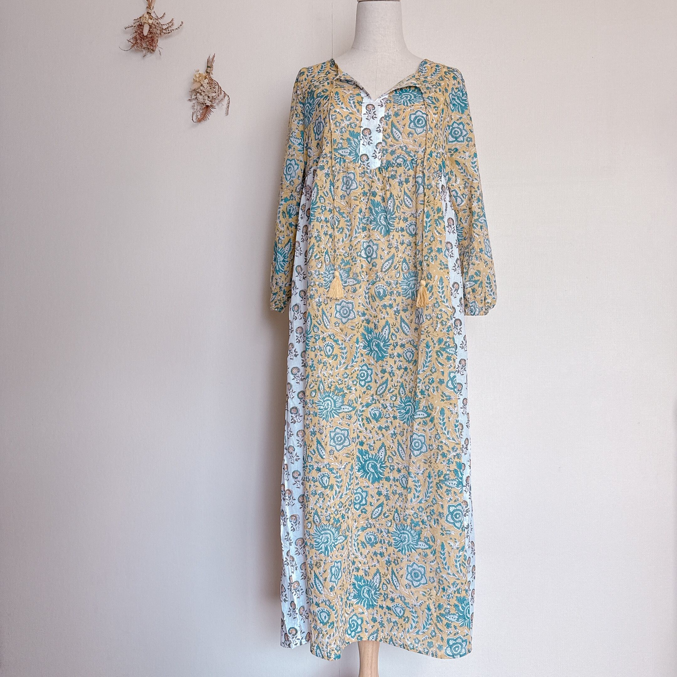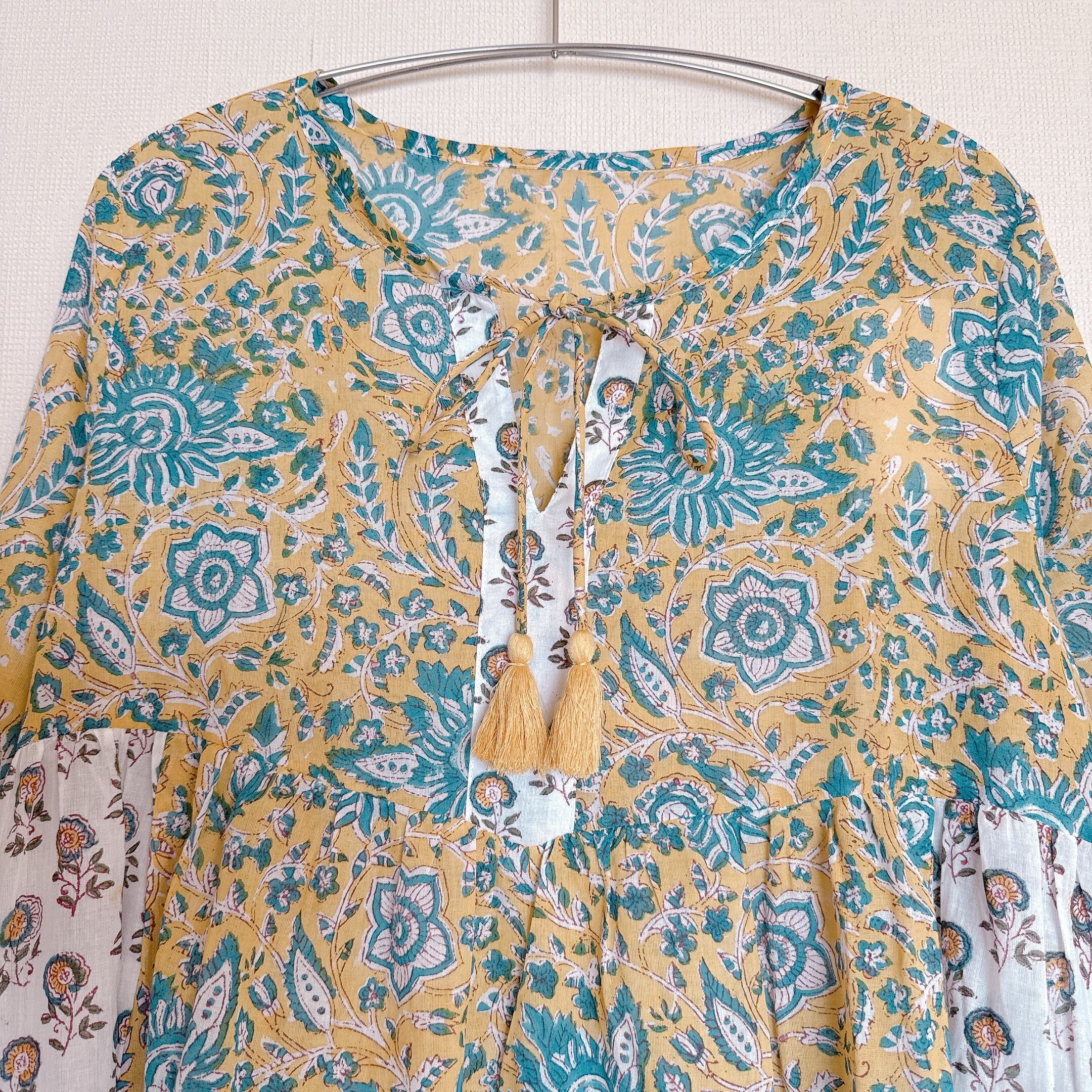 インド雑貨/インドの手仕事/インド好き/インド輸入/インドのワンピース/ブロックプリントワンピース/木版プリントワンピース/イエロー