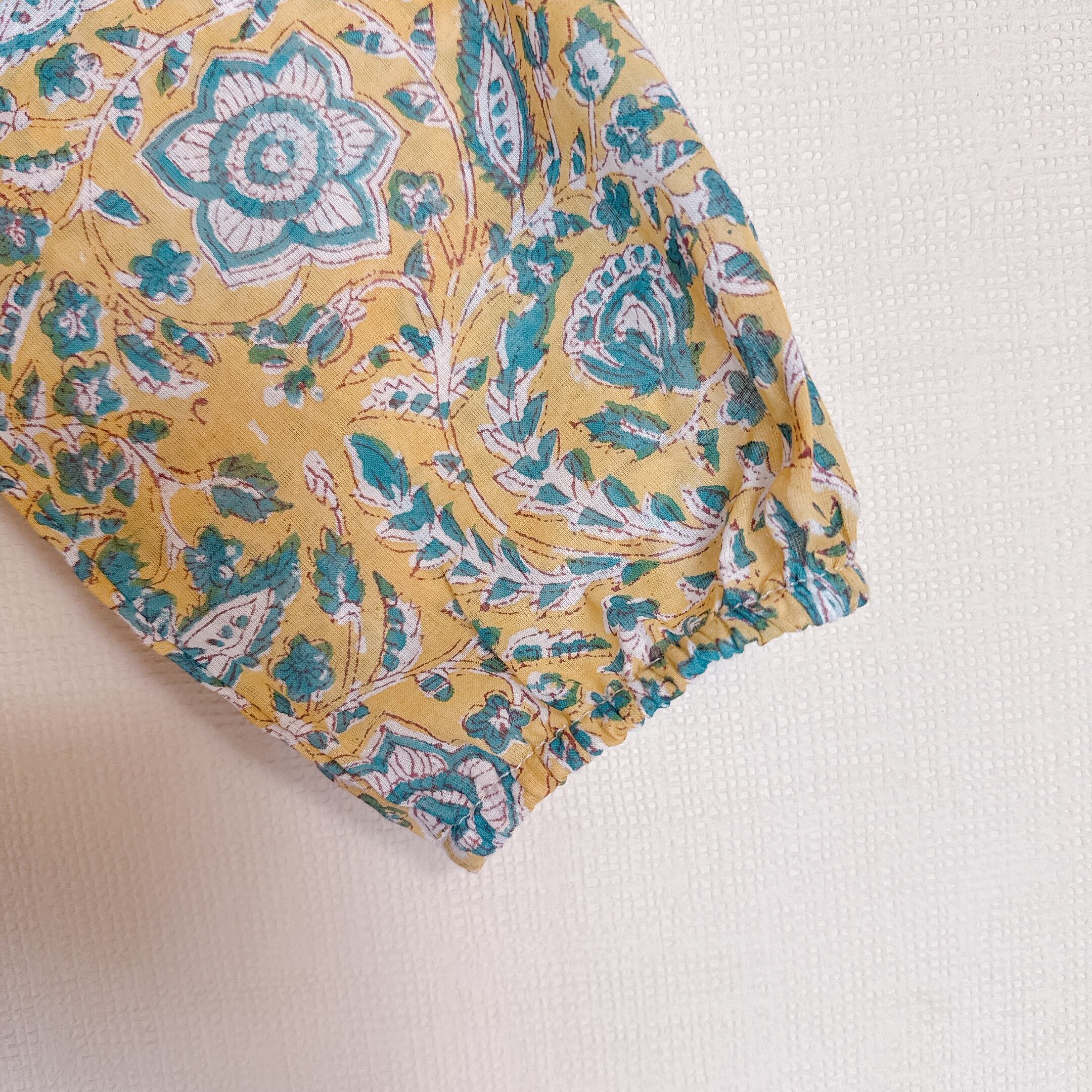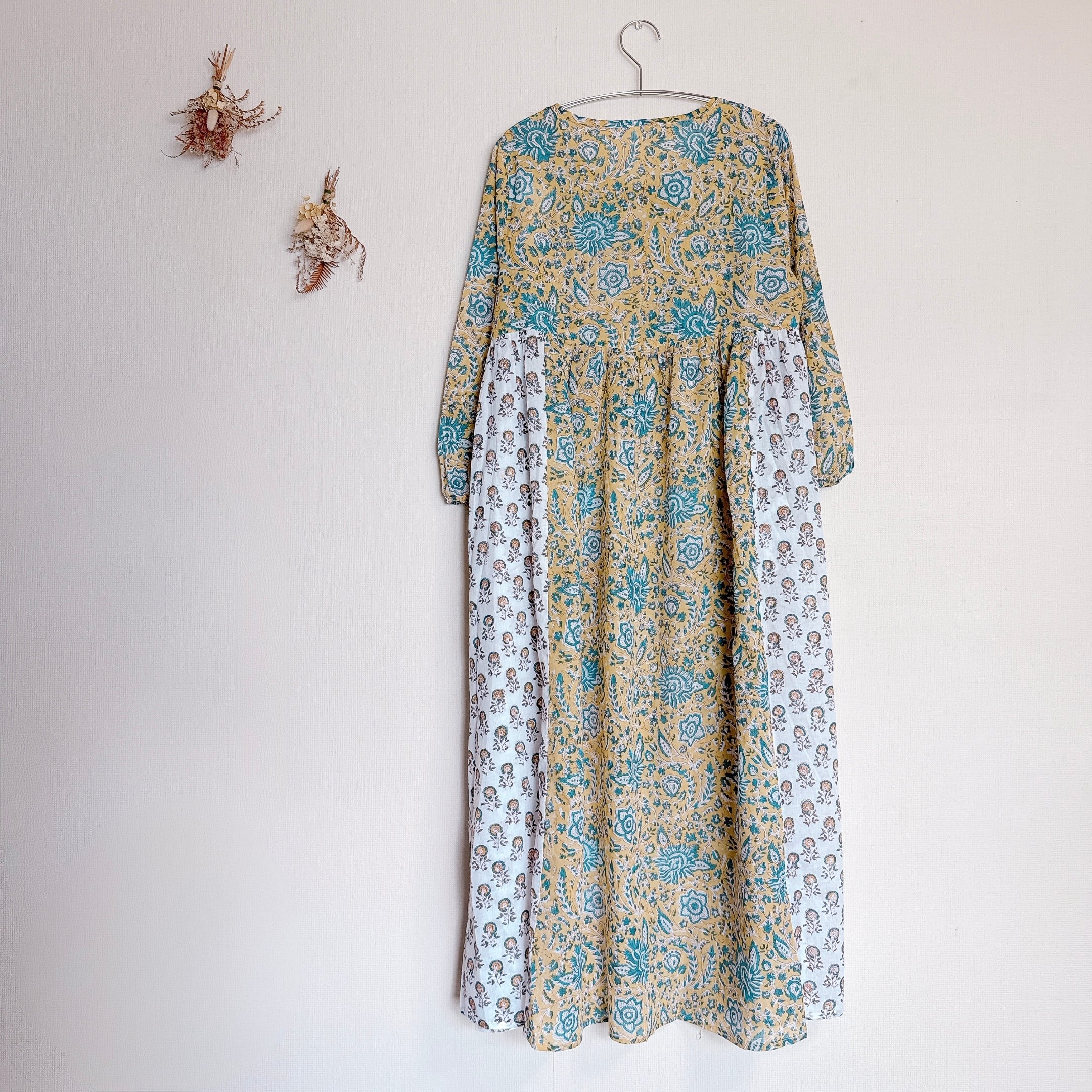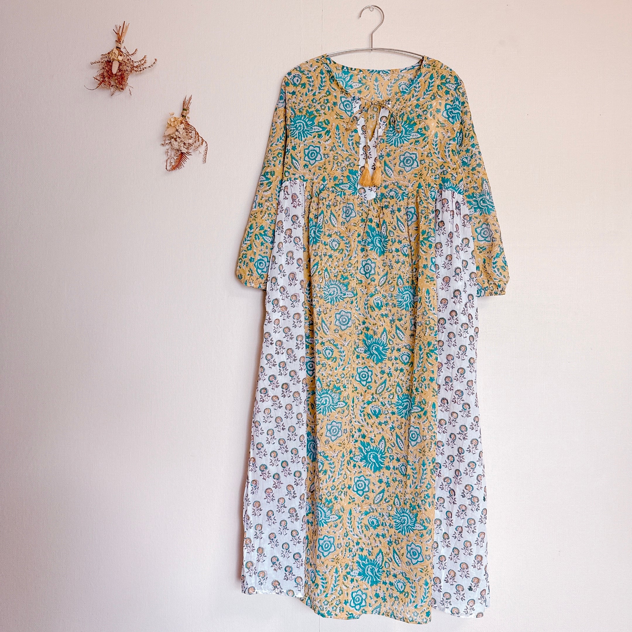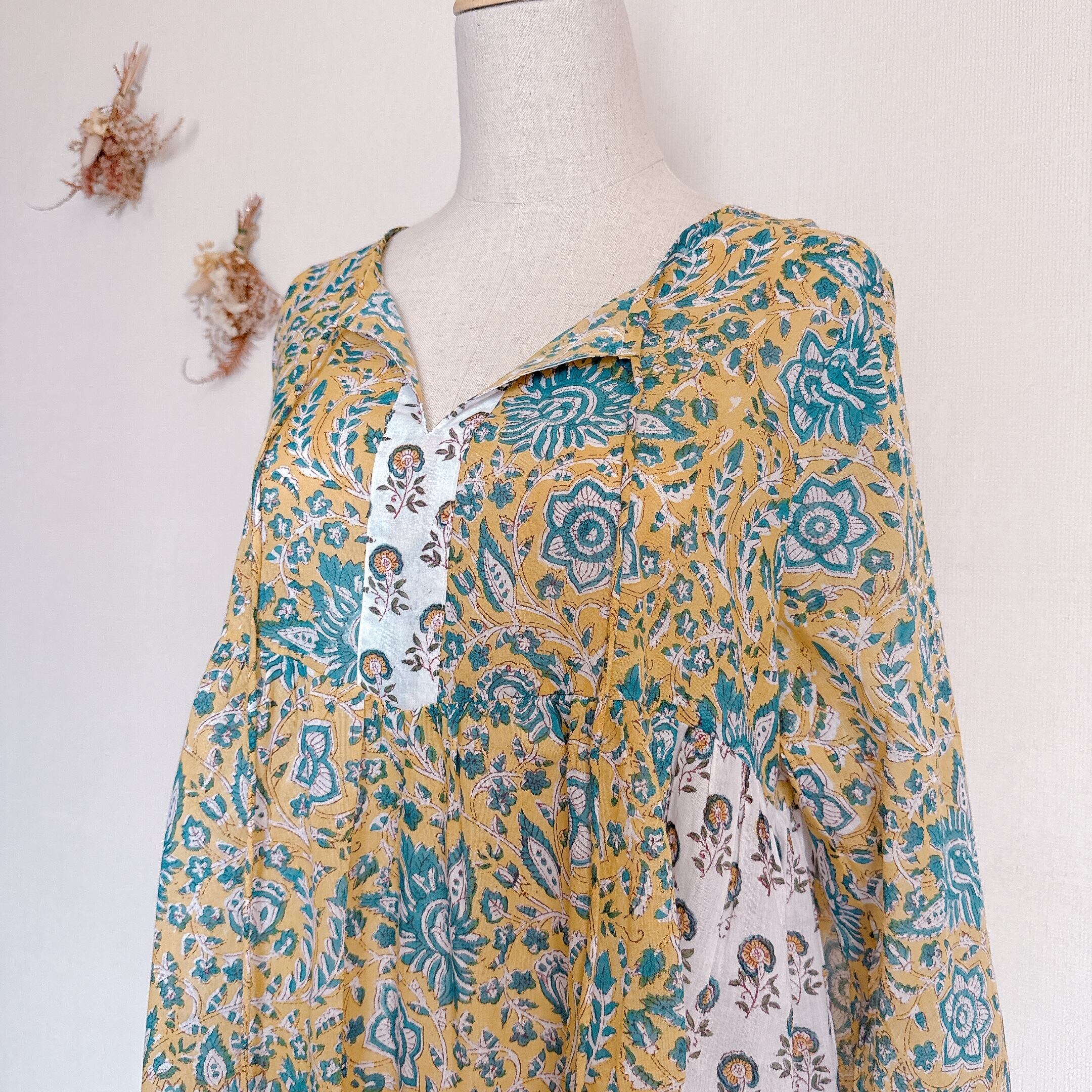 インド雑貨/インドの手仕事/インド好き/インド輸入/インドのワンピース/ブロックプリントワンピース/木版プリントワンピース/イエロー