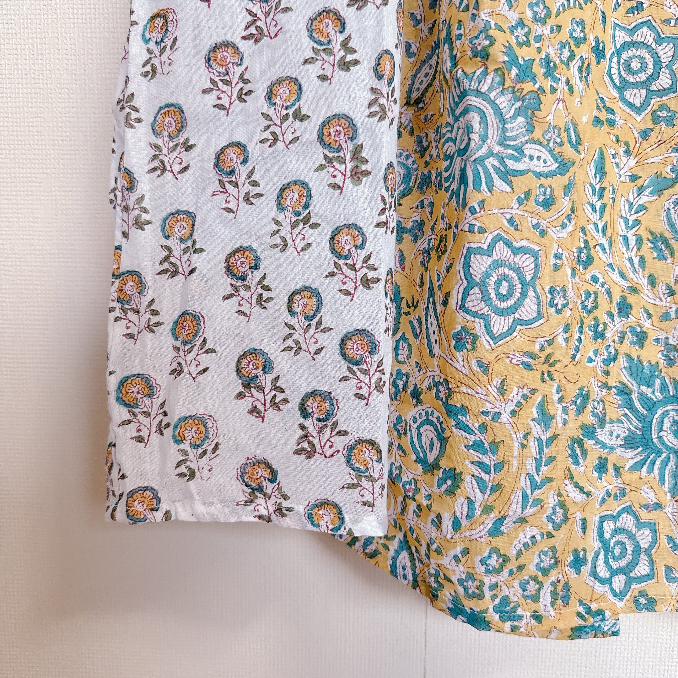 ハンドブロックプリントの特性上、絵柄の色にズレや濃淡が生じますが、製法の持ち味ですので楽しんでいただければ幸いです。