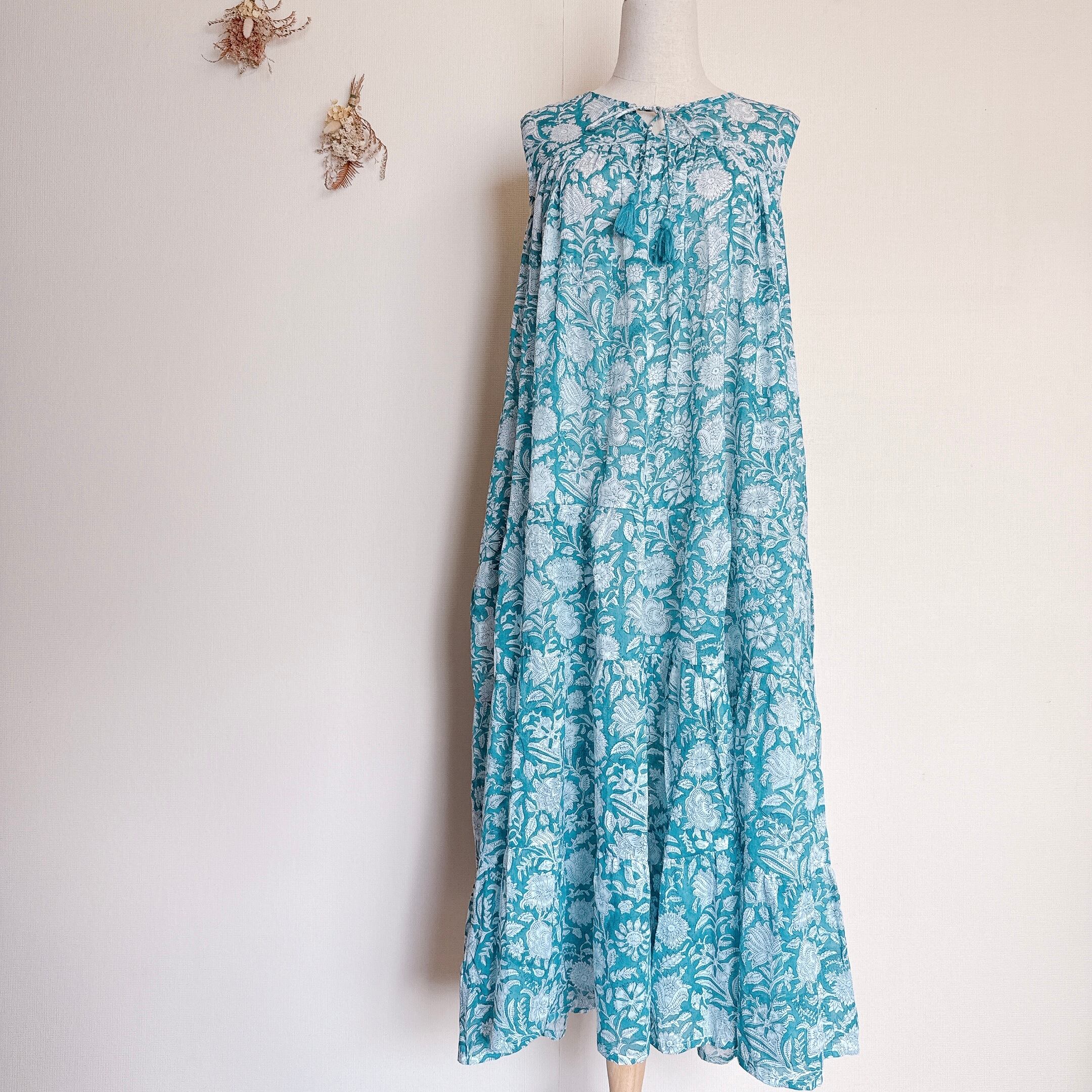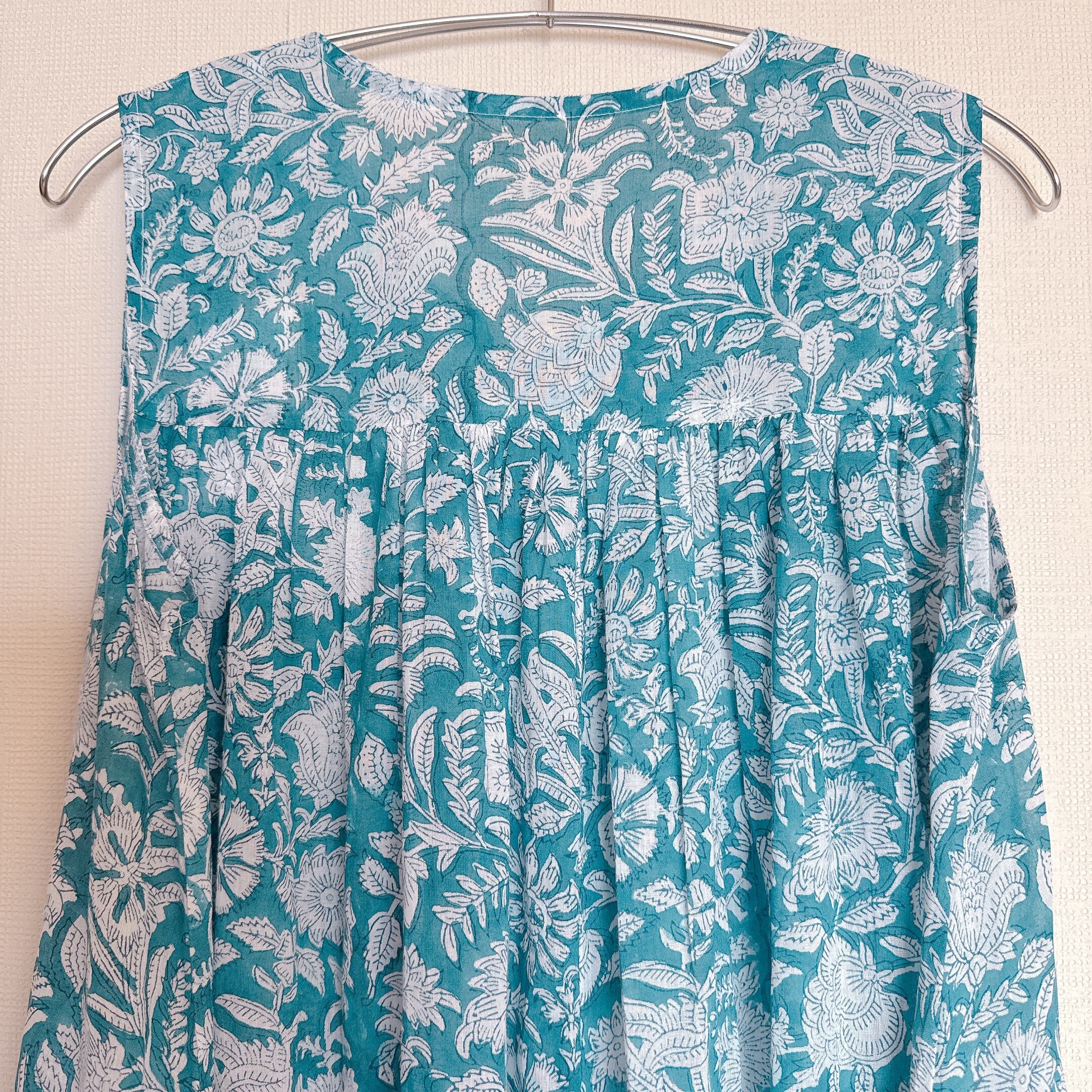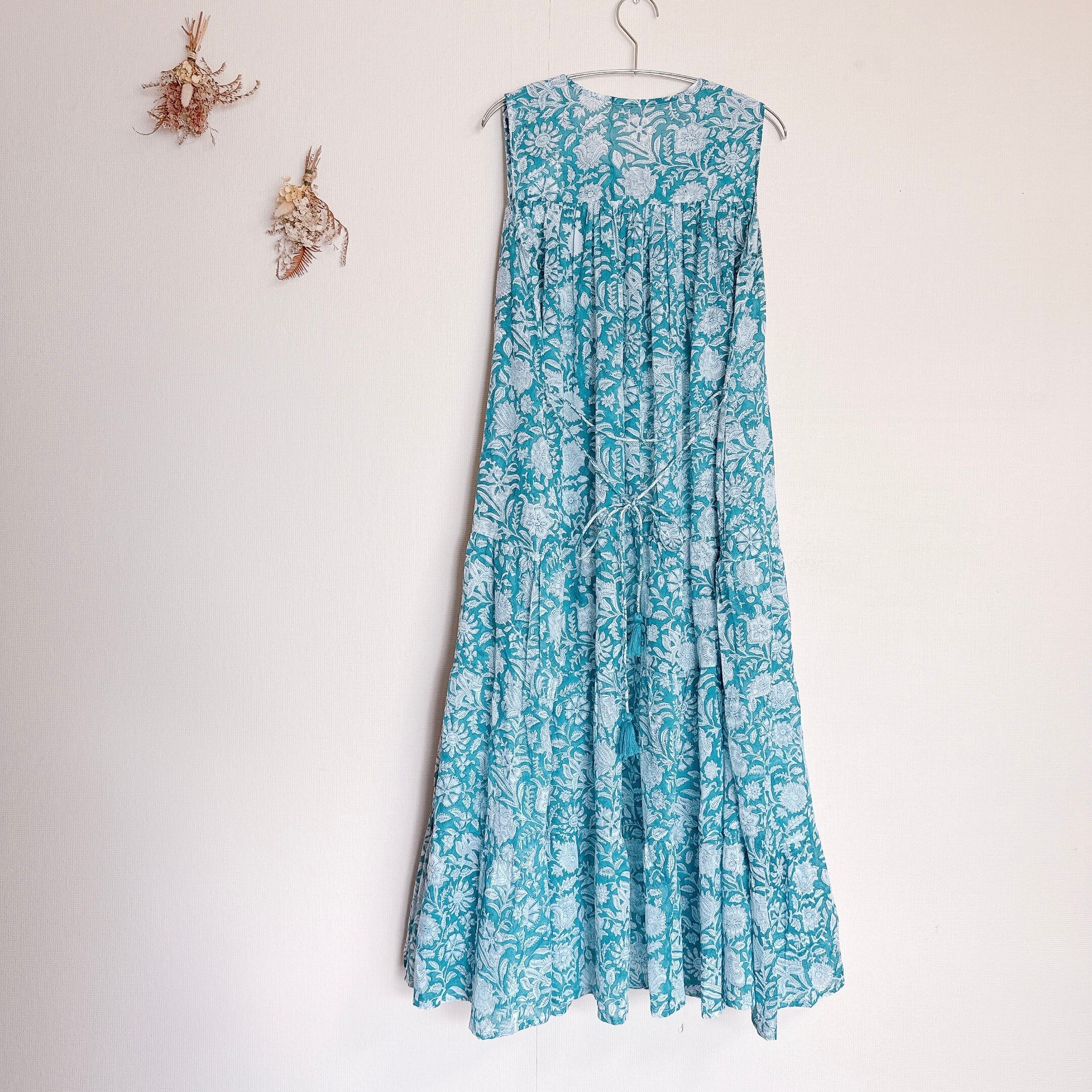 インド雑貨/インドの手仕事/インド好き/インド輸入/インドのワンピース/ブロックプリントワンピース/木版プリントワンピース/ノースリーブワンピース/ブルー