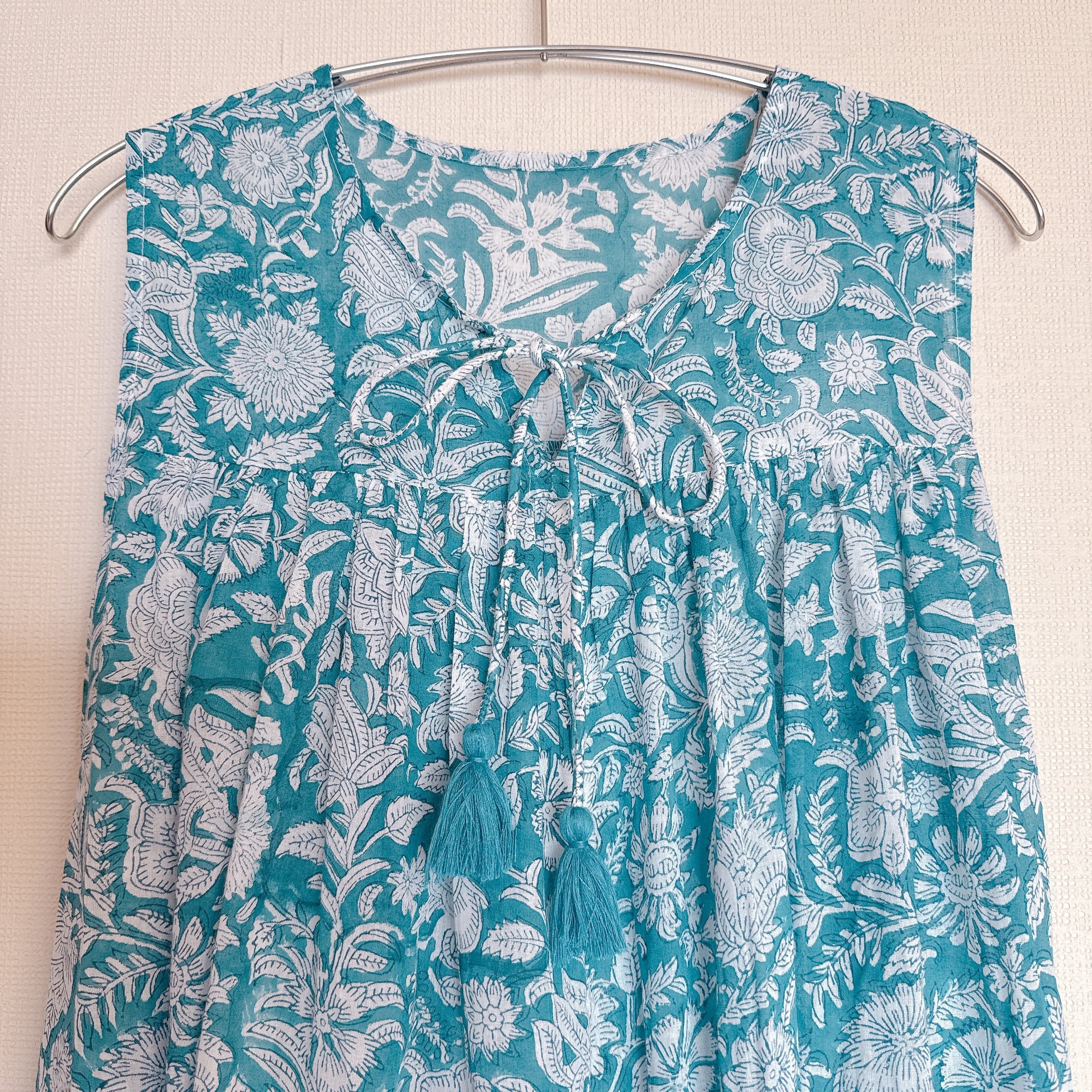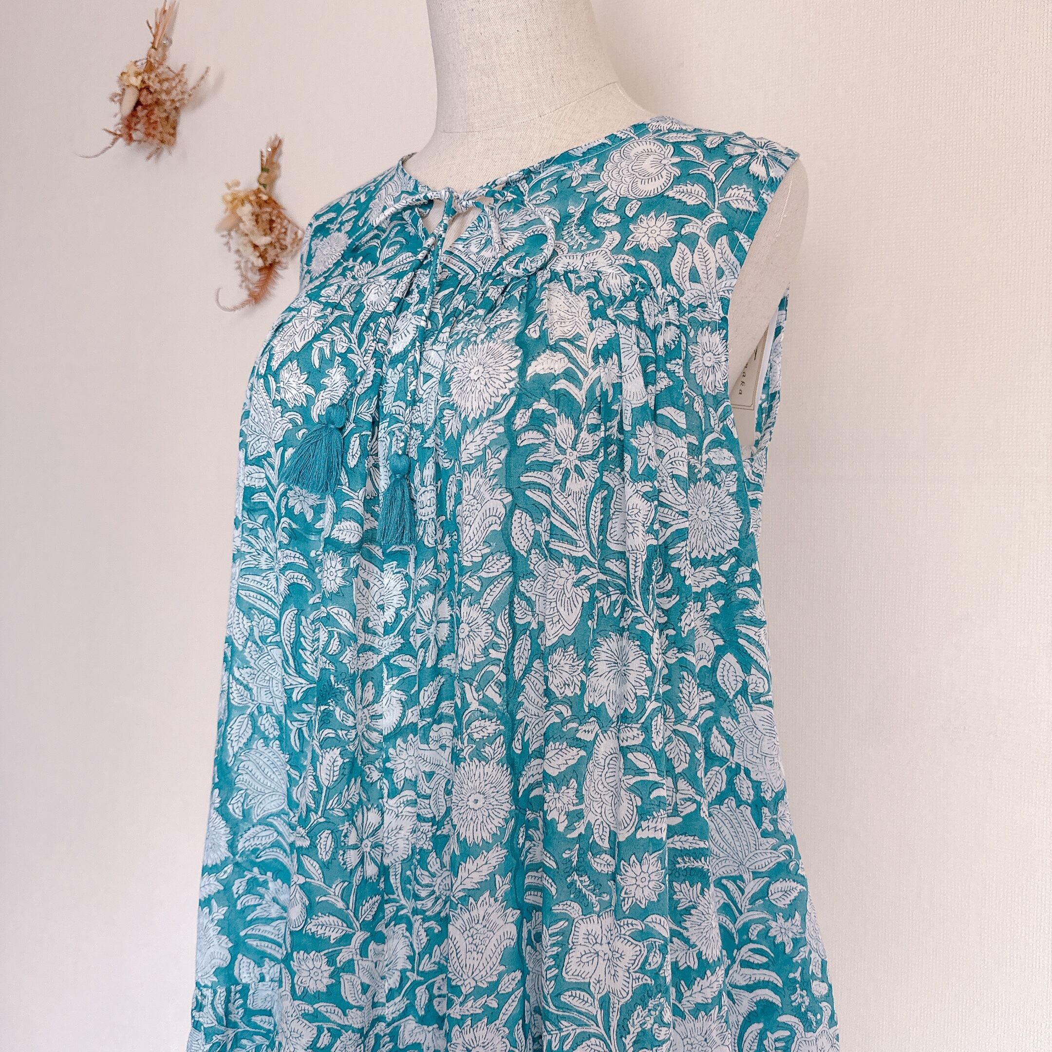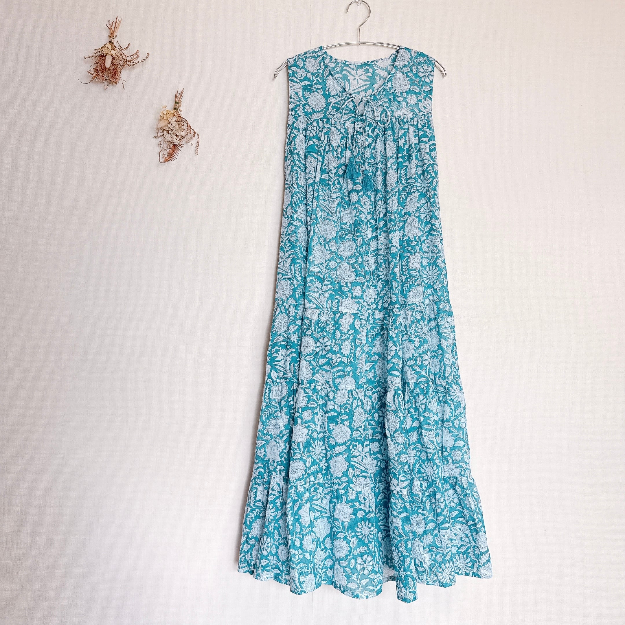 インド雑貨/インドの手仕事/インド好き/インド輸入/インドのワンピース/ブロックプリントワンピース/木版プリントワンピース/ノースリーブワンピース/ブルー