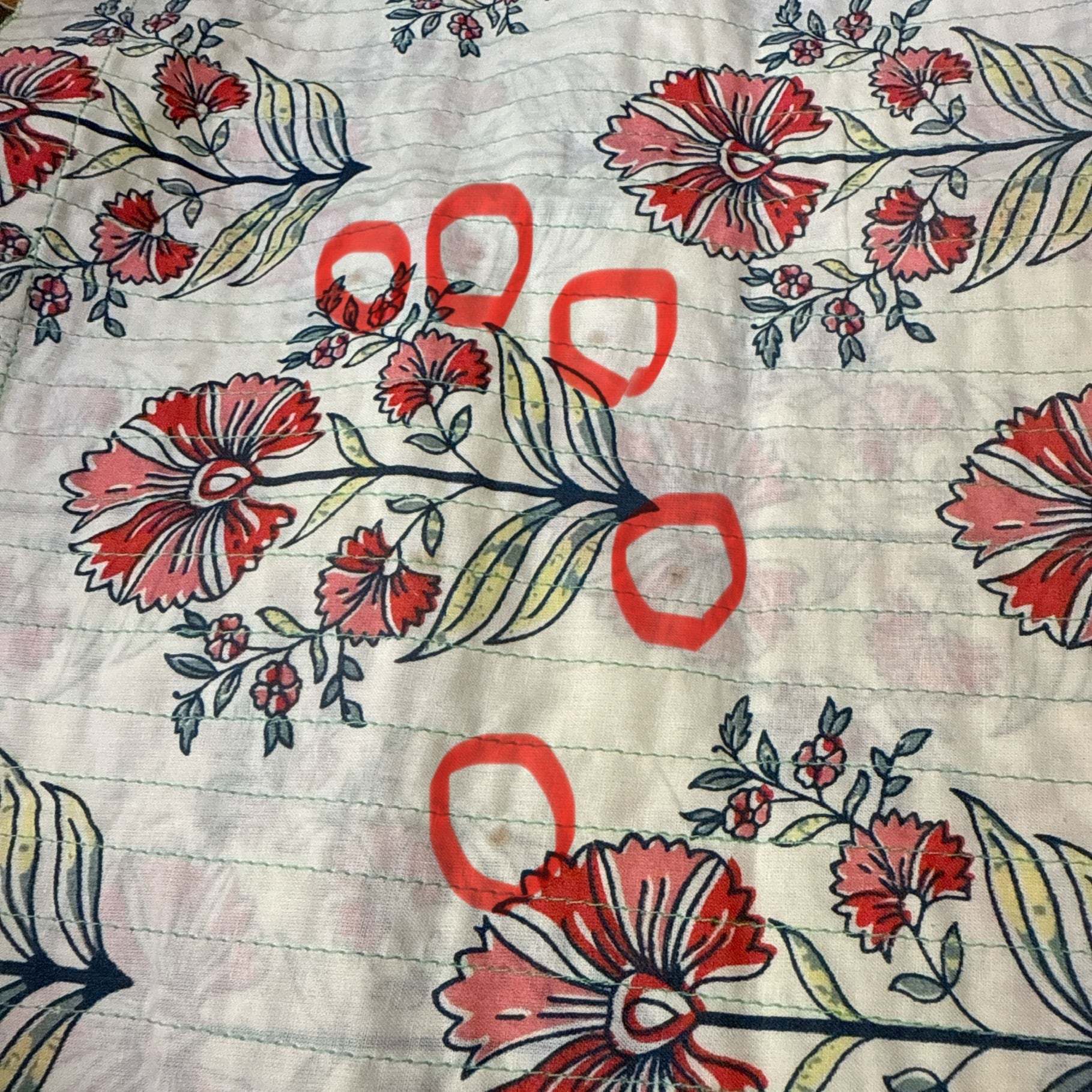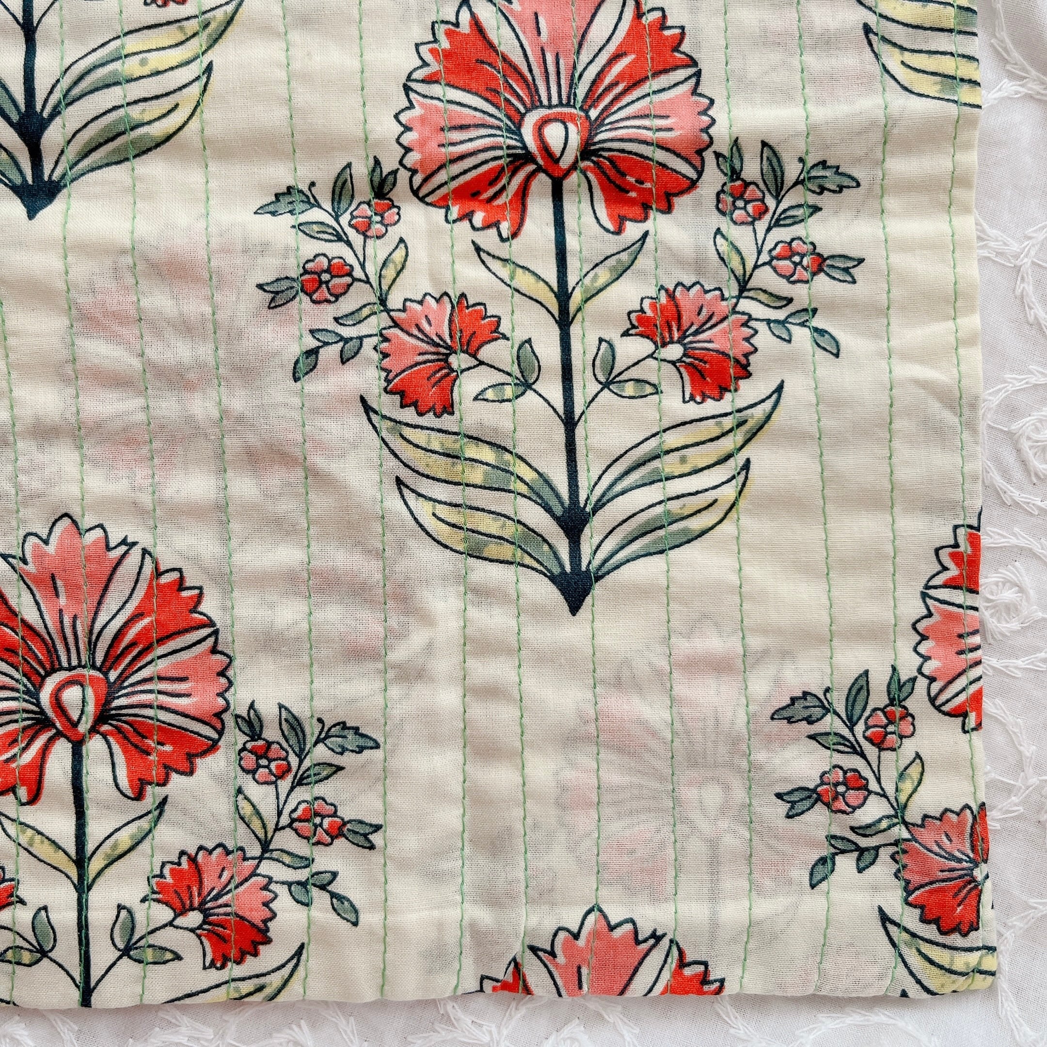 生地はコットン2枚重ねで、淡いグリーンの糸でキルトのように縦に縫い線が入っています。