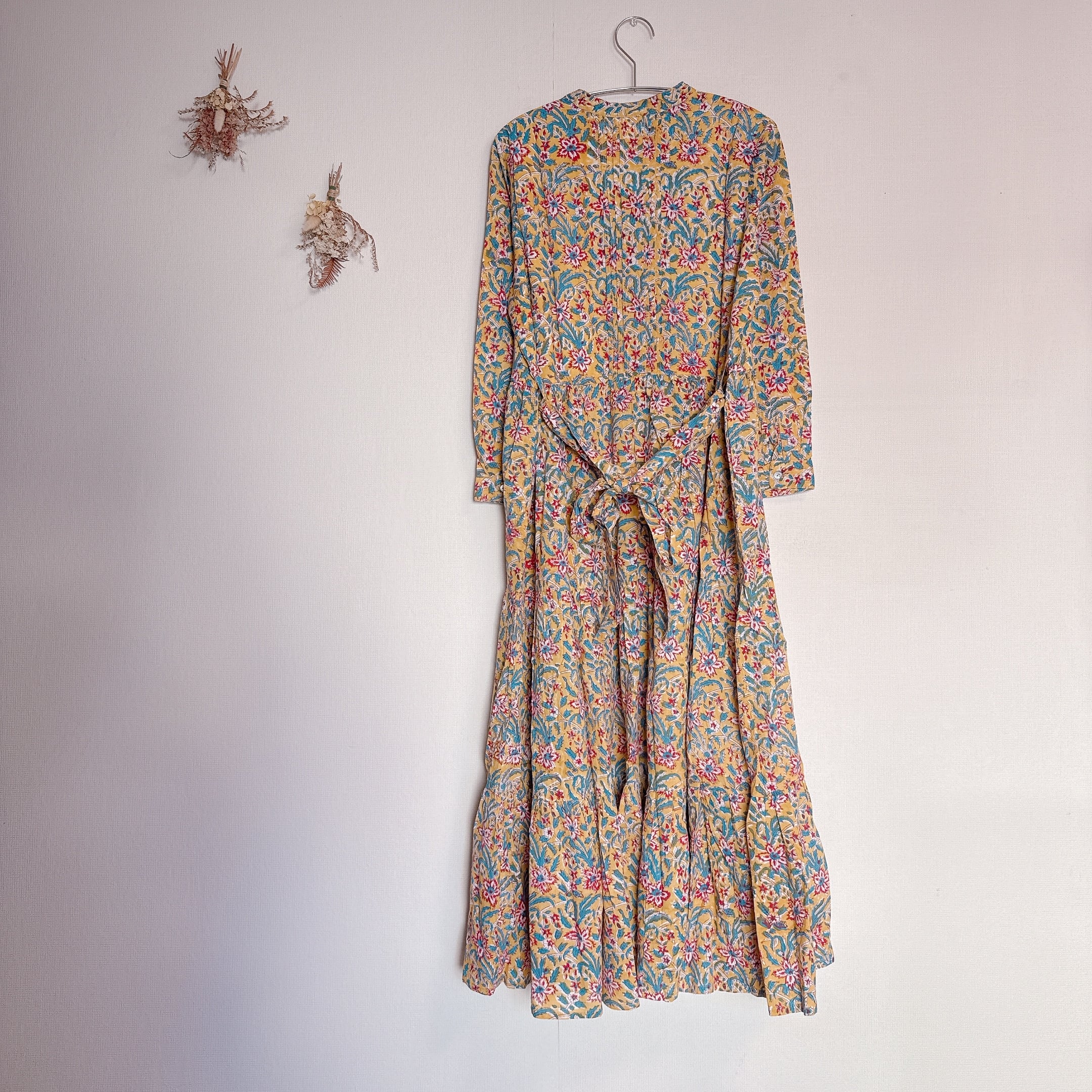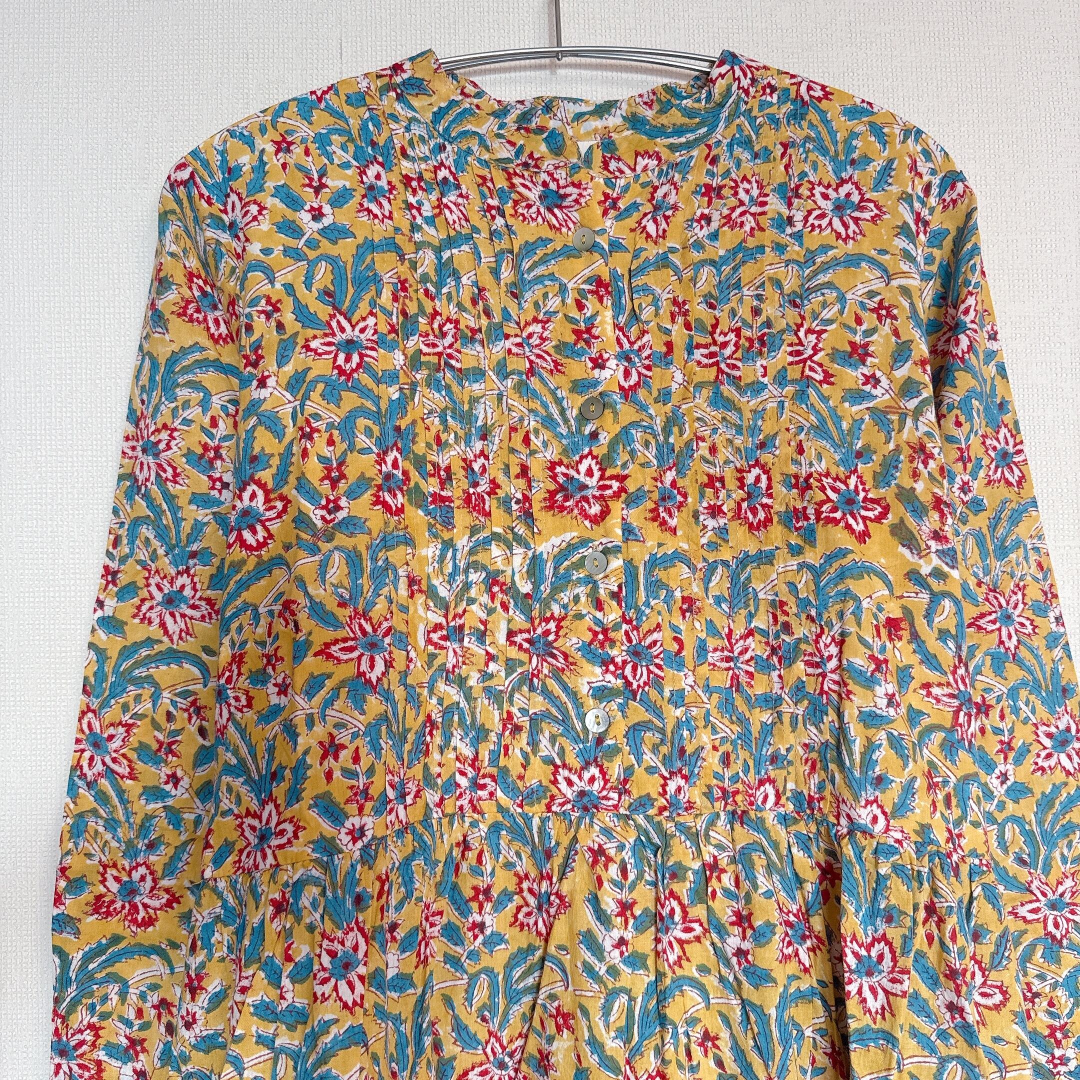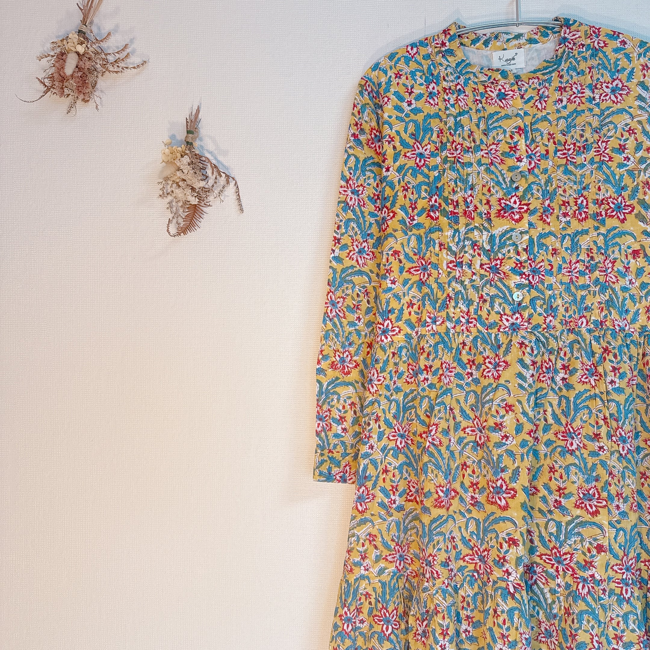 インド雑貨/インドの手仕事/インド好き/インド輸入/インドのワンピース/イエロー/花柄/ブロックプリントワンピース