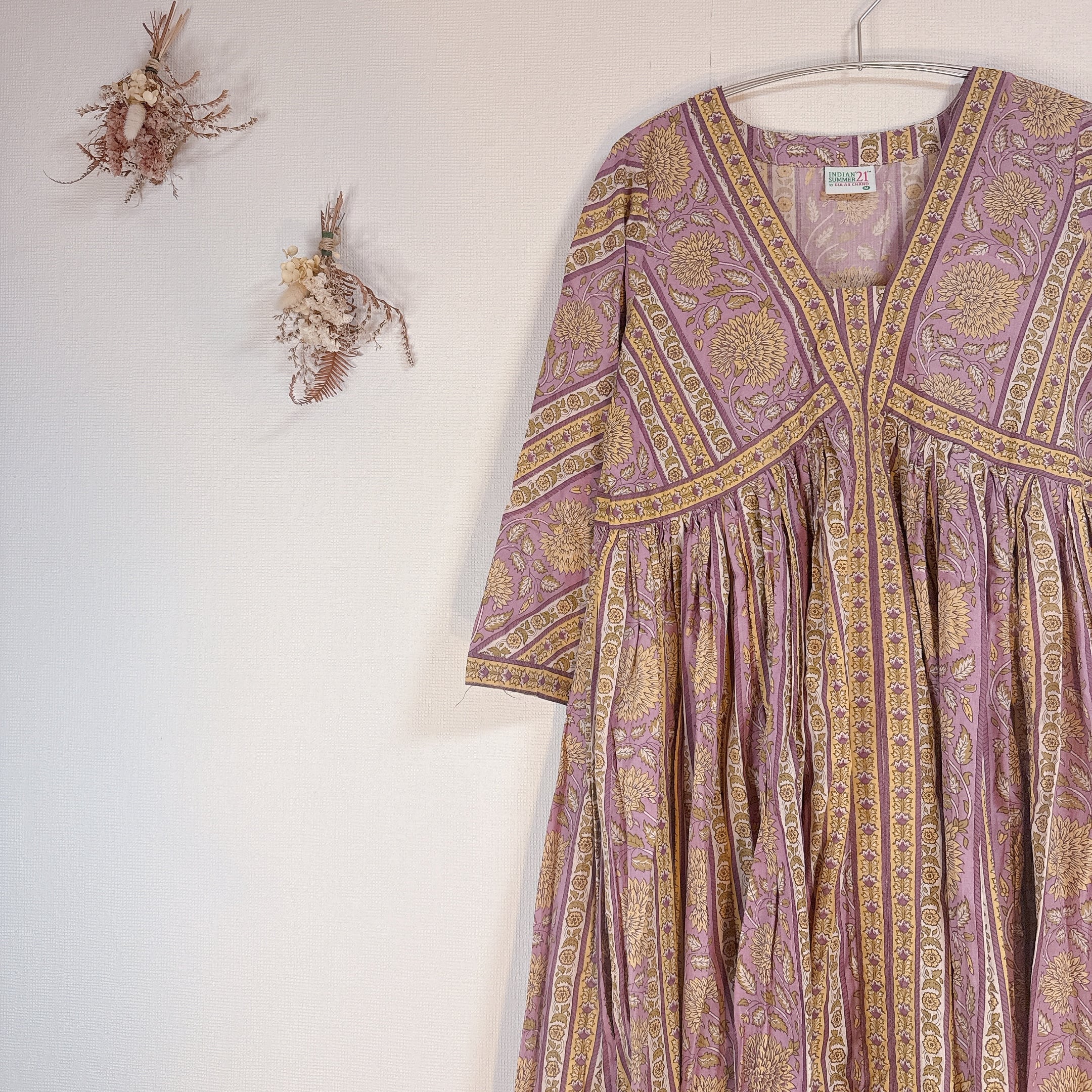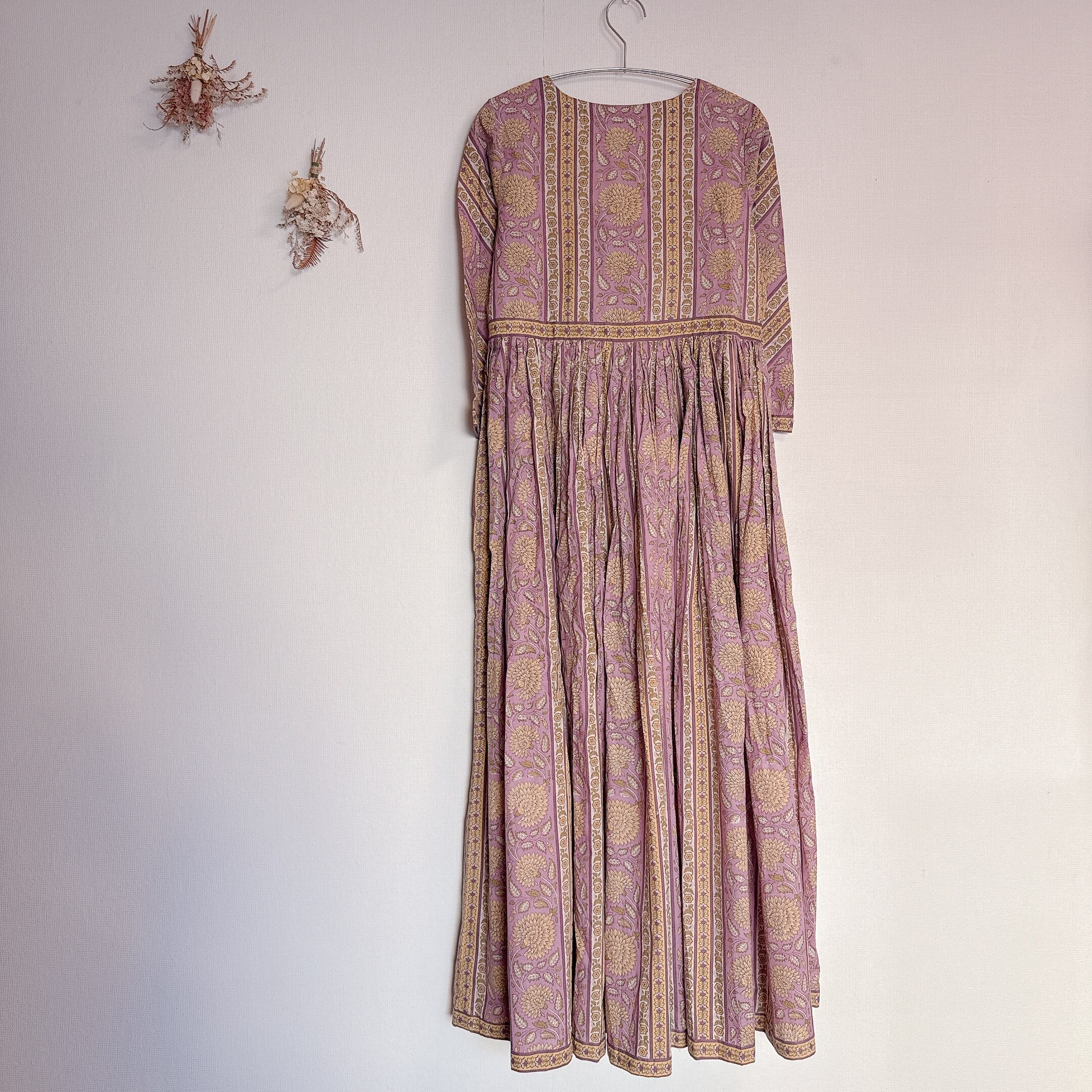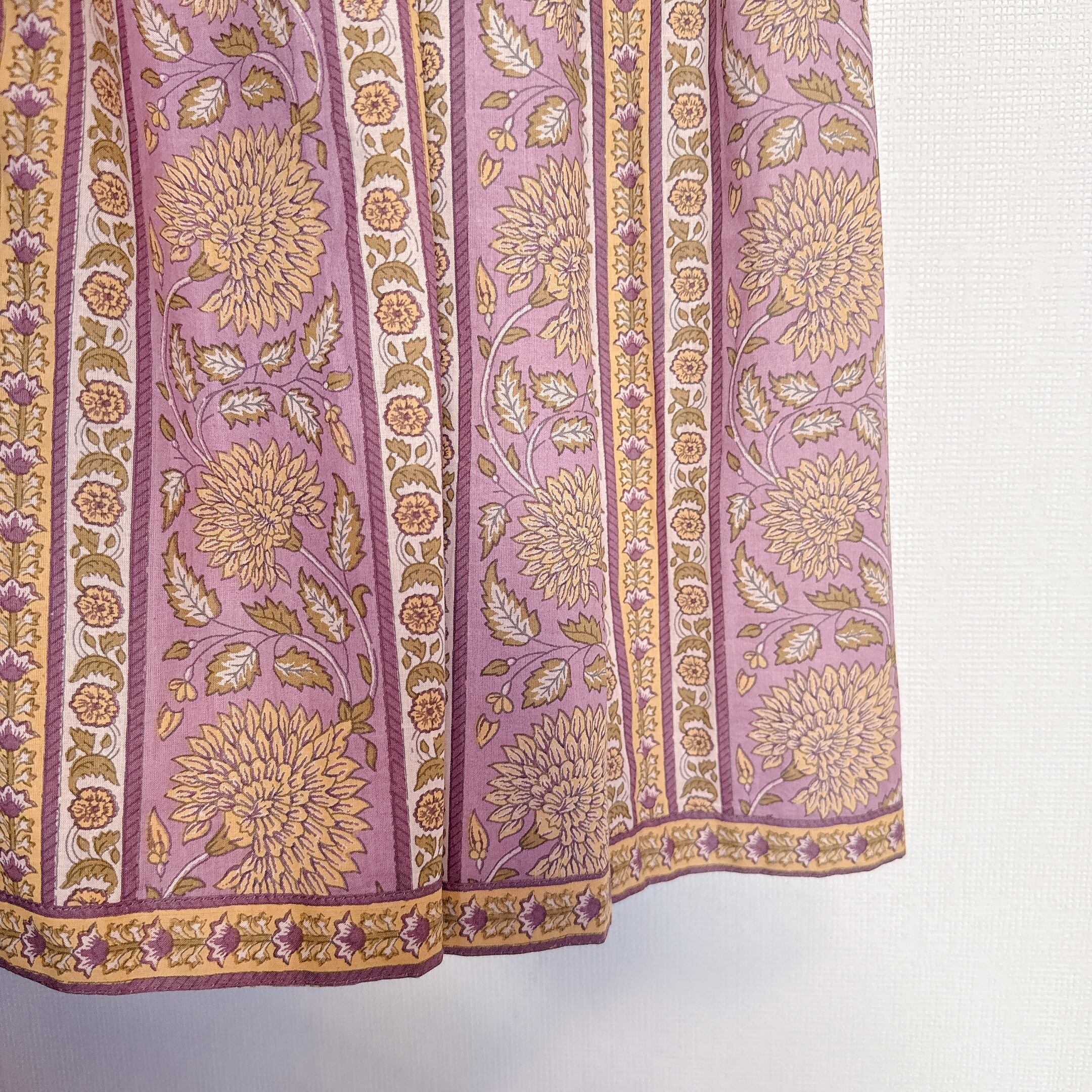 インド雑貨/インドの手仕事/インド好き/インド輸入/インドのワンピース/パープル/イエロー/花柄/ブロックプリントワンピース