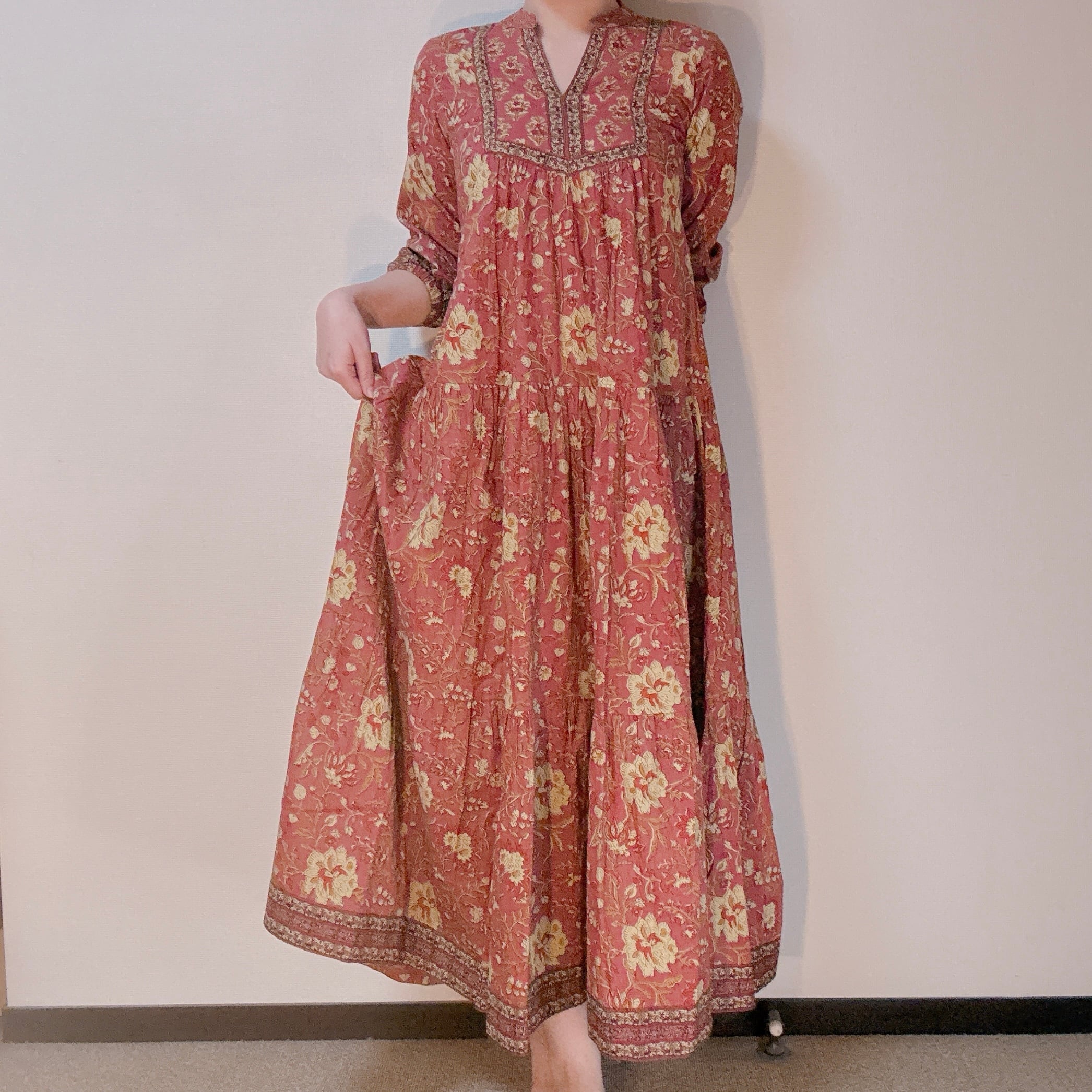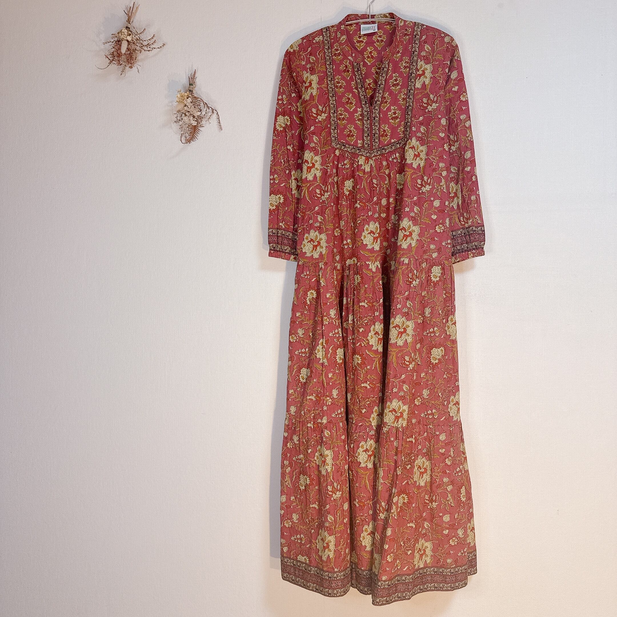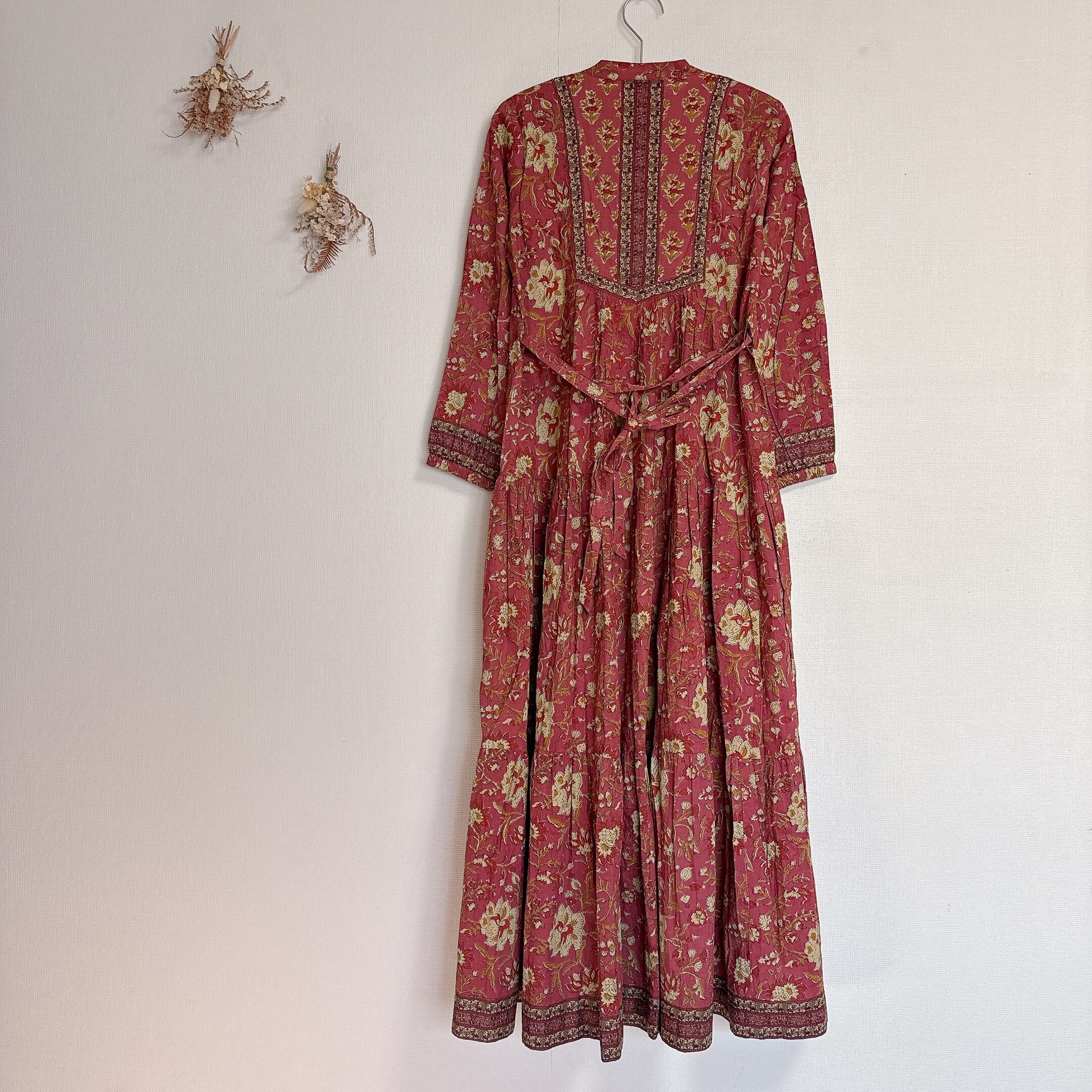 インド雑貨/インドの手仕事/インド好き/インド輸入/インドのワンピース/くすみレッド/花柄/ブロックプリントワンピース