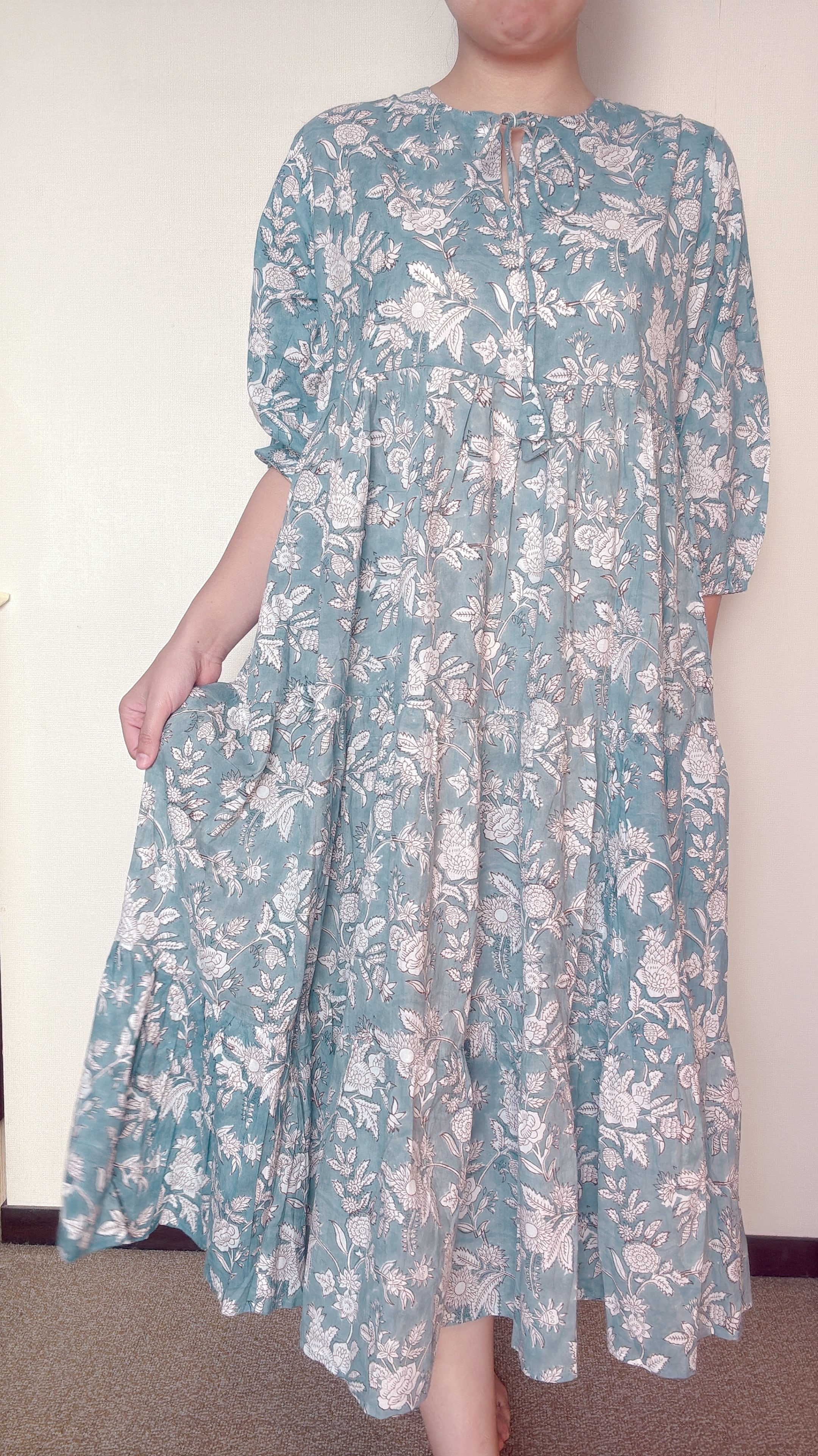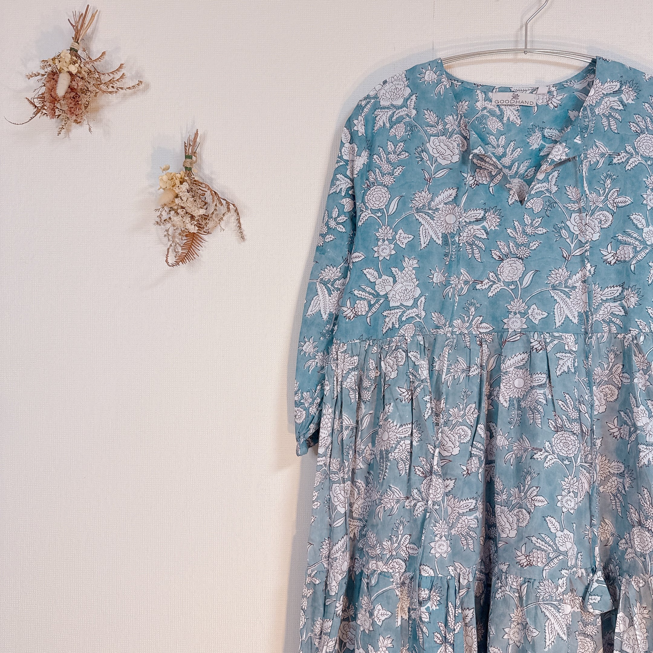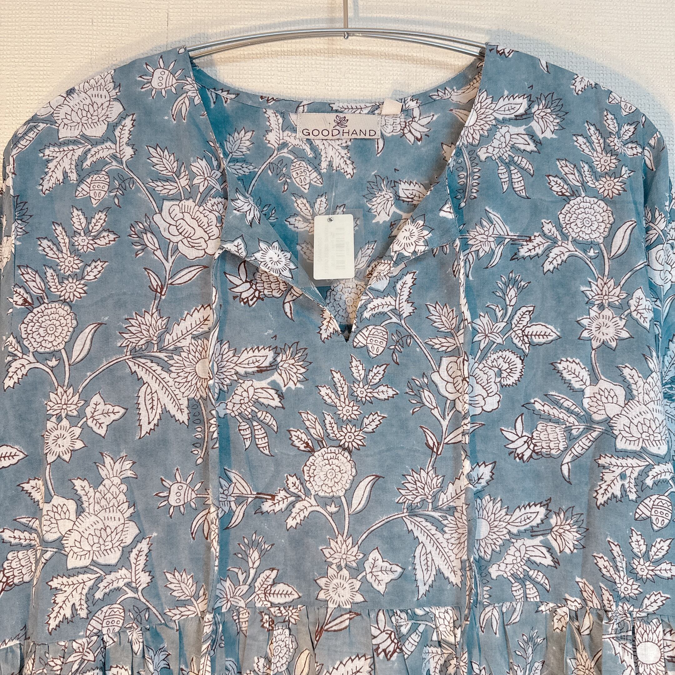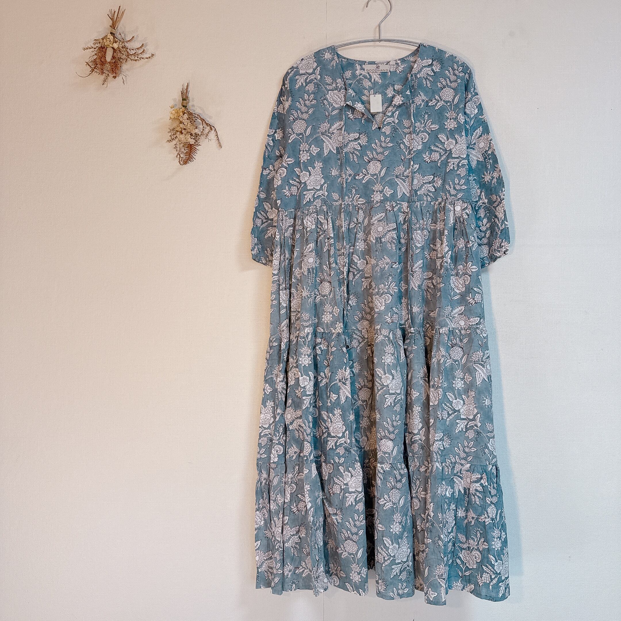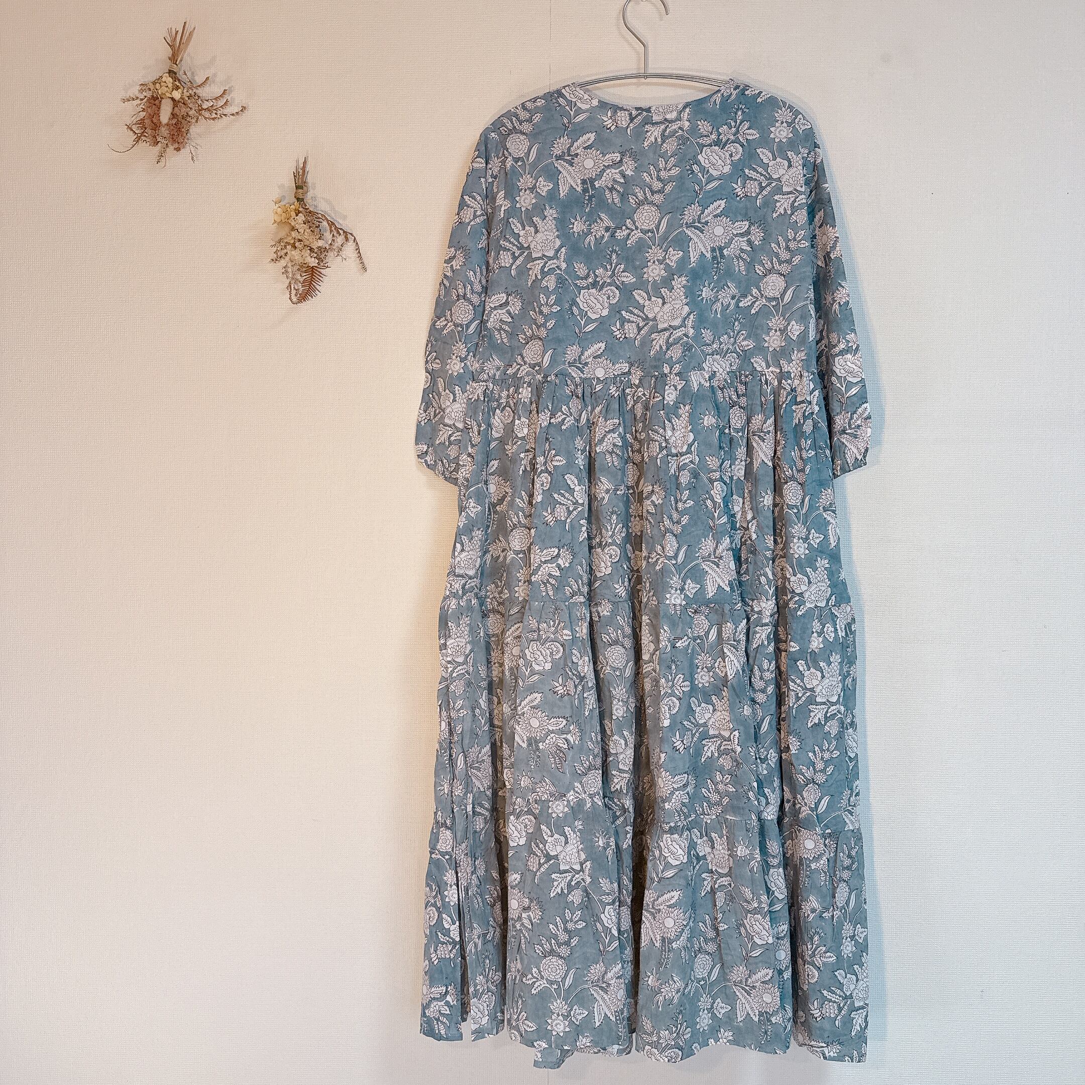 インド雑貨/インドの手仕事/インド好き/インド輸入/インドのワンピース/くすみブルー/ブロックプリントワンピース
