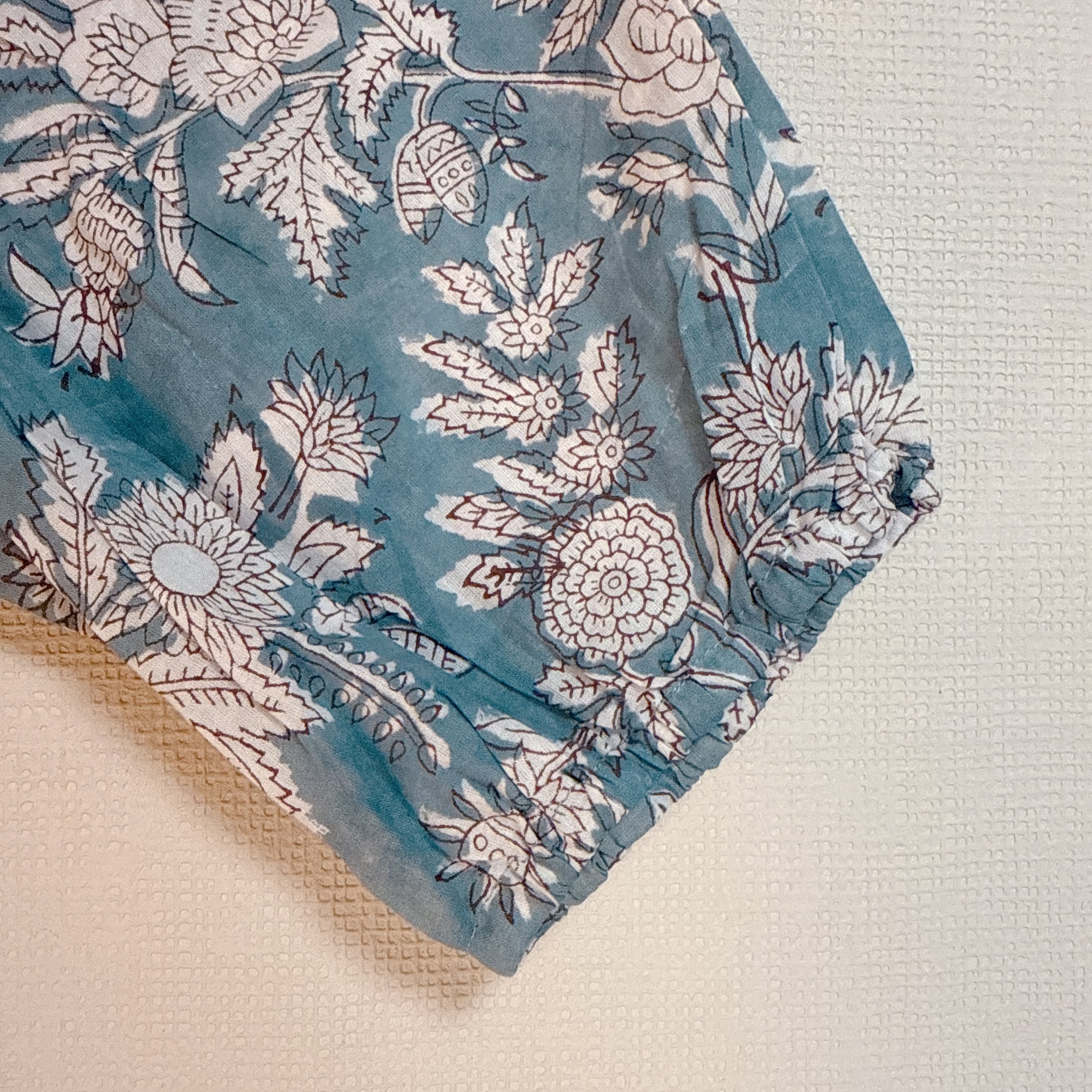 インド製のブロックプリントの為、インクのズレ・にじみがあったり、縫製時のマーキングが一部残っていたり、少々形が均一でない事もありますが、そこも一つの持ち味として楽しんでいただければ嬉しいです。