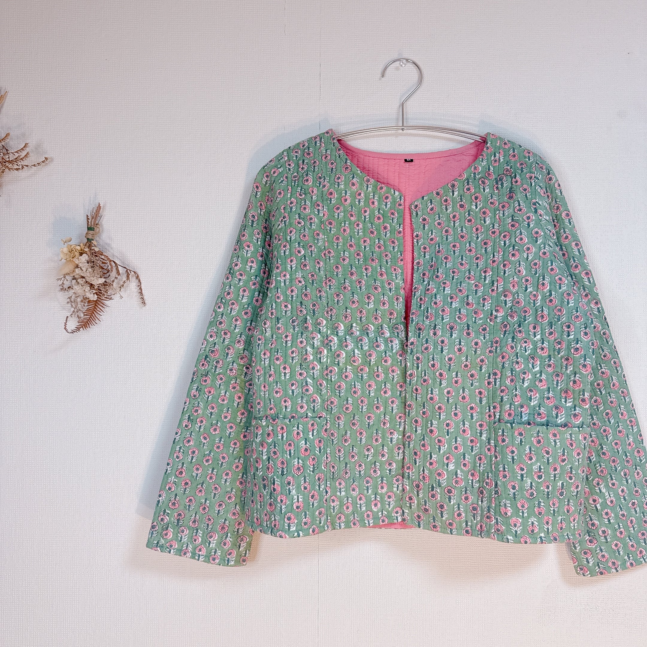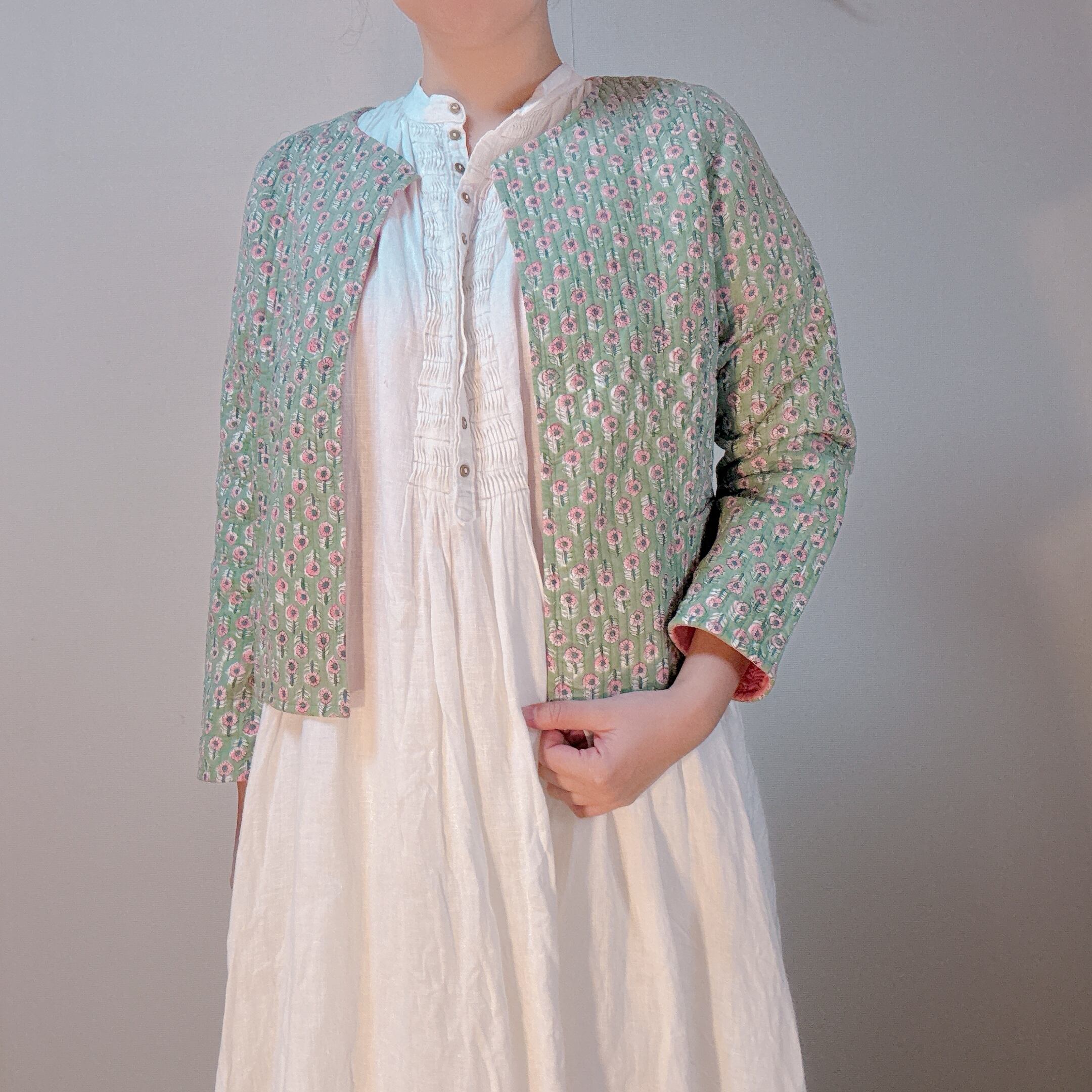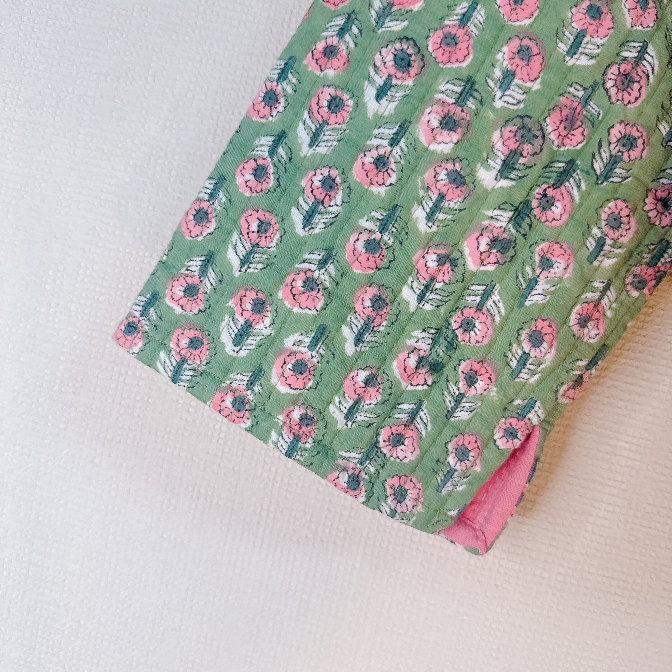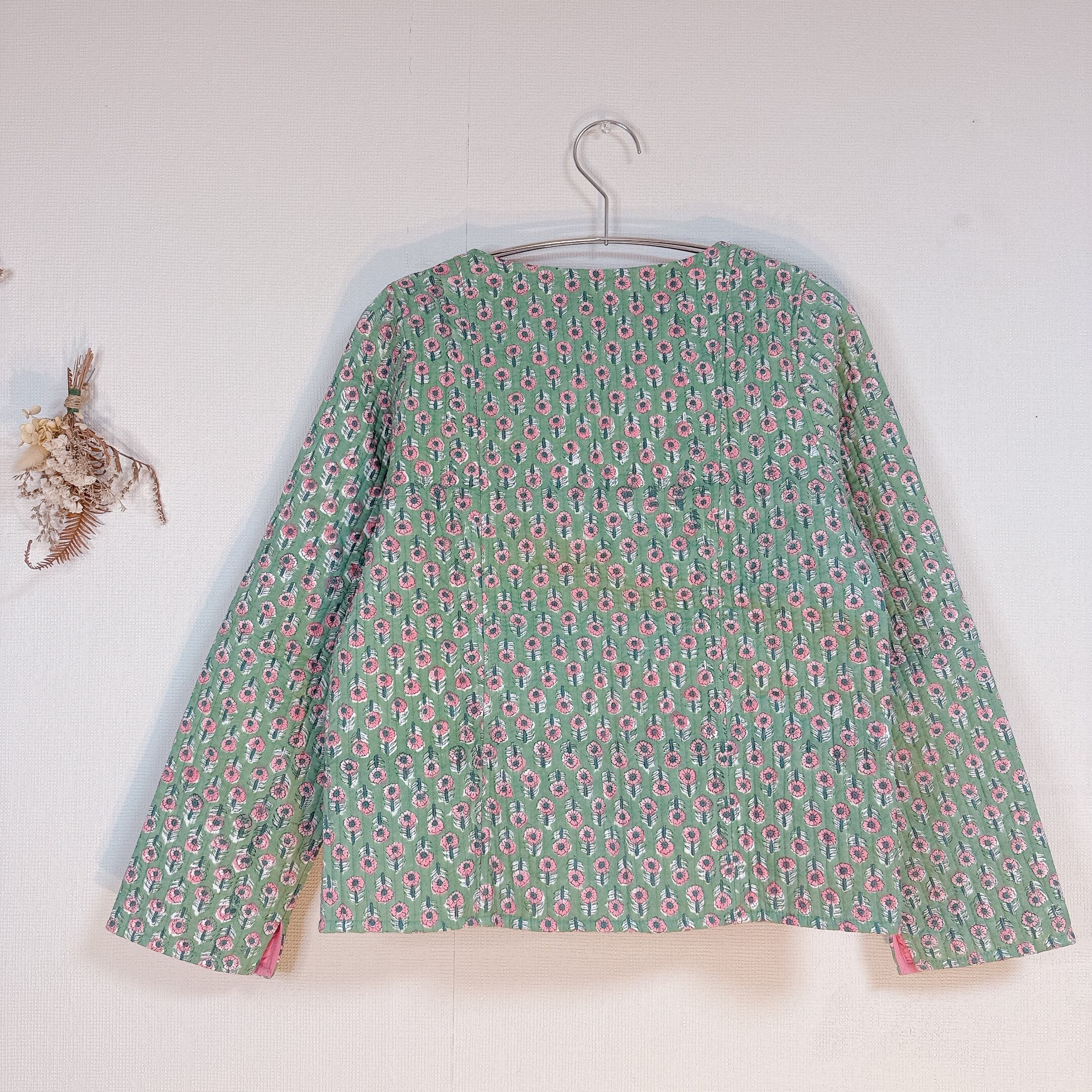 落ち着いたグリーンとピンクの小花のコントラストが可愛いのキルトジャケット
