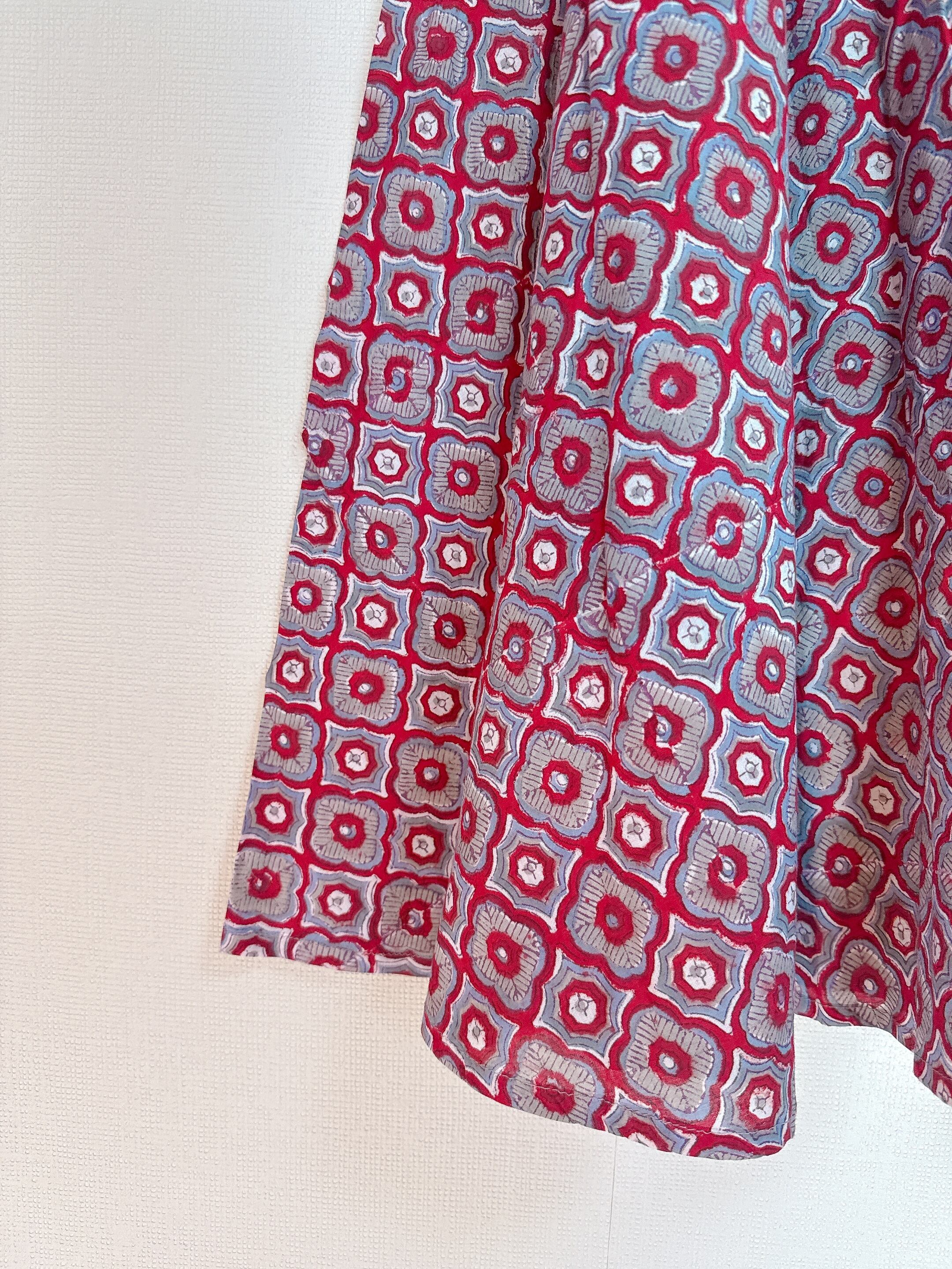 インド製のブロックプリントの為、インクのズレ・にじみがあったり、縫製時のマーキングが一部残っていたり、少々形が均一でない事もありますが、そこも一つの持ち味として楽しんでいただければ嬉しいです。