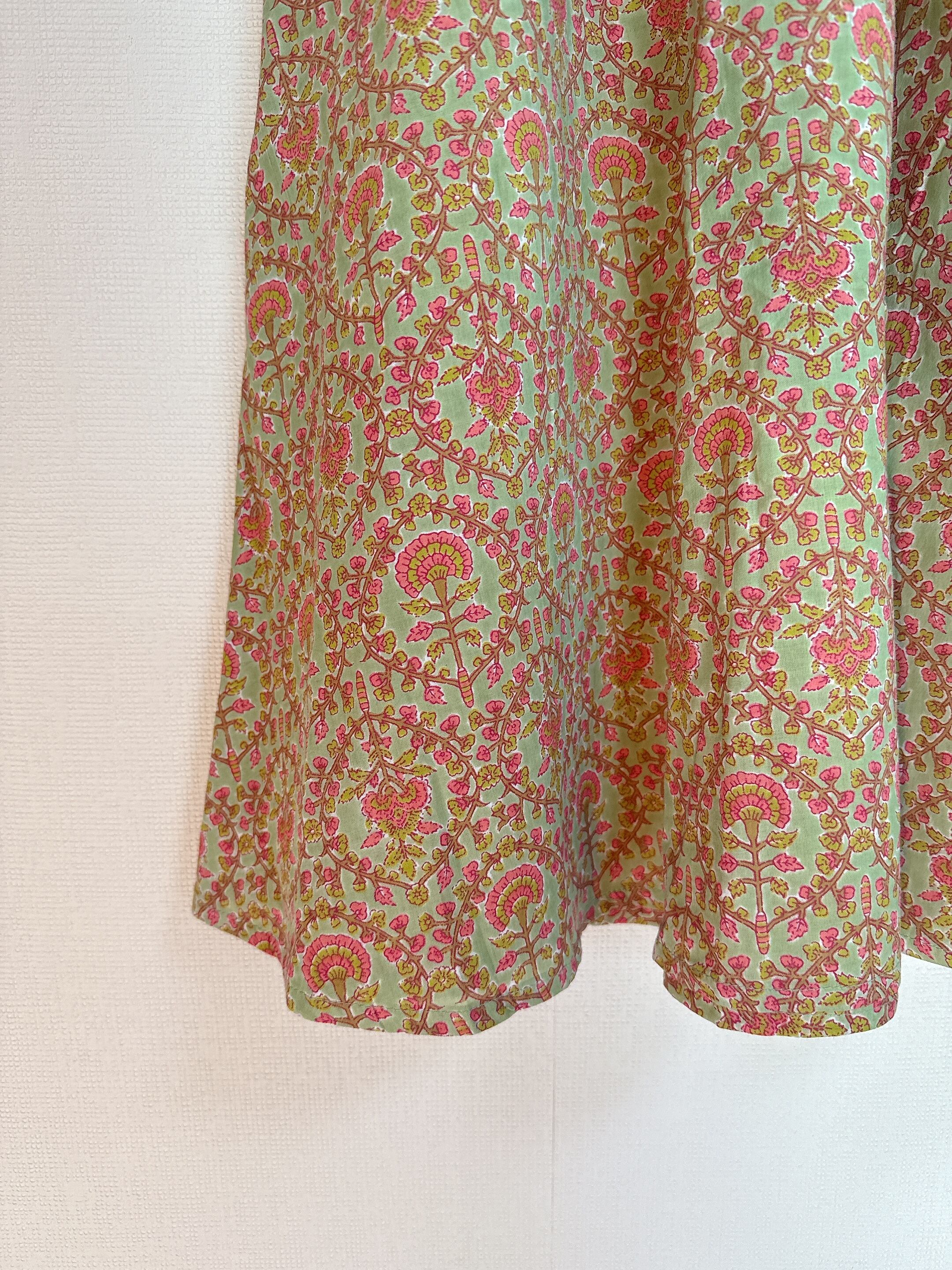 インド製のブロックプリントの為、インクのズレ・にじみがあったり、縫製時のマーキングが一部残っていたり、少々形が均一でない事もありますが、そこも一つの持ち味として楽しんでいただければ嬉しいです。