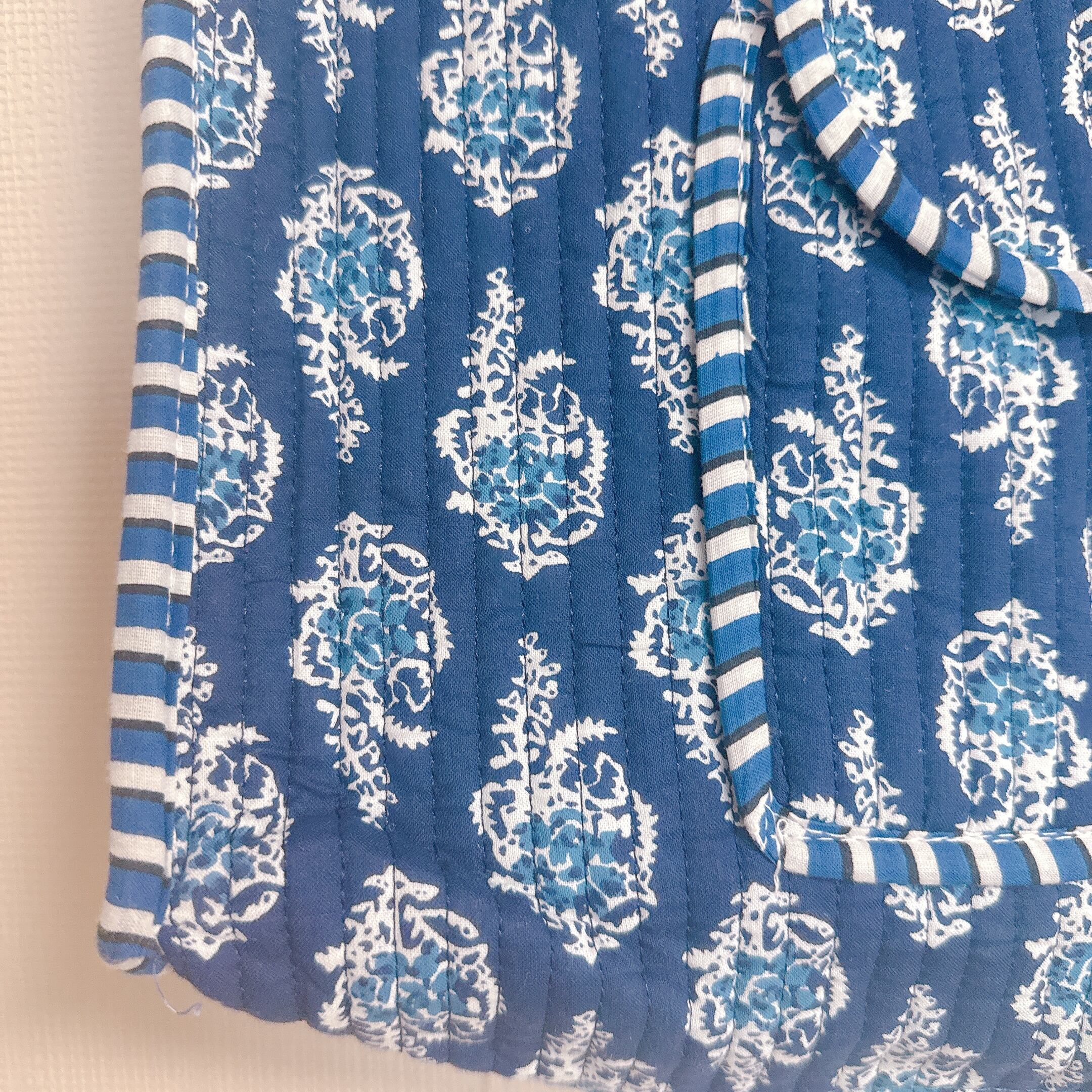 インド製のブロックプリントの為、インクのズレ・にじみがあったり、縫製時のマーキングが一部残っていたり、少々形が均一でない事もありますが、そこも一つの持ち味として楽しんでいただければ嬉しいです。