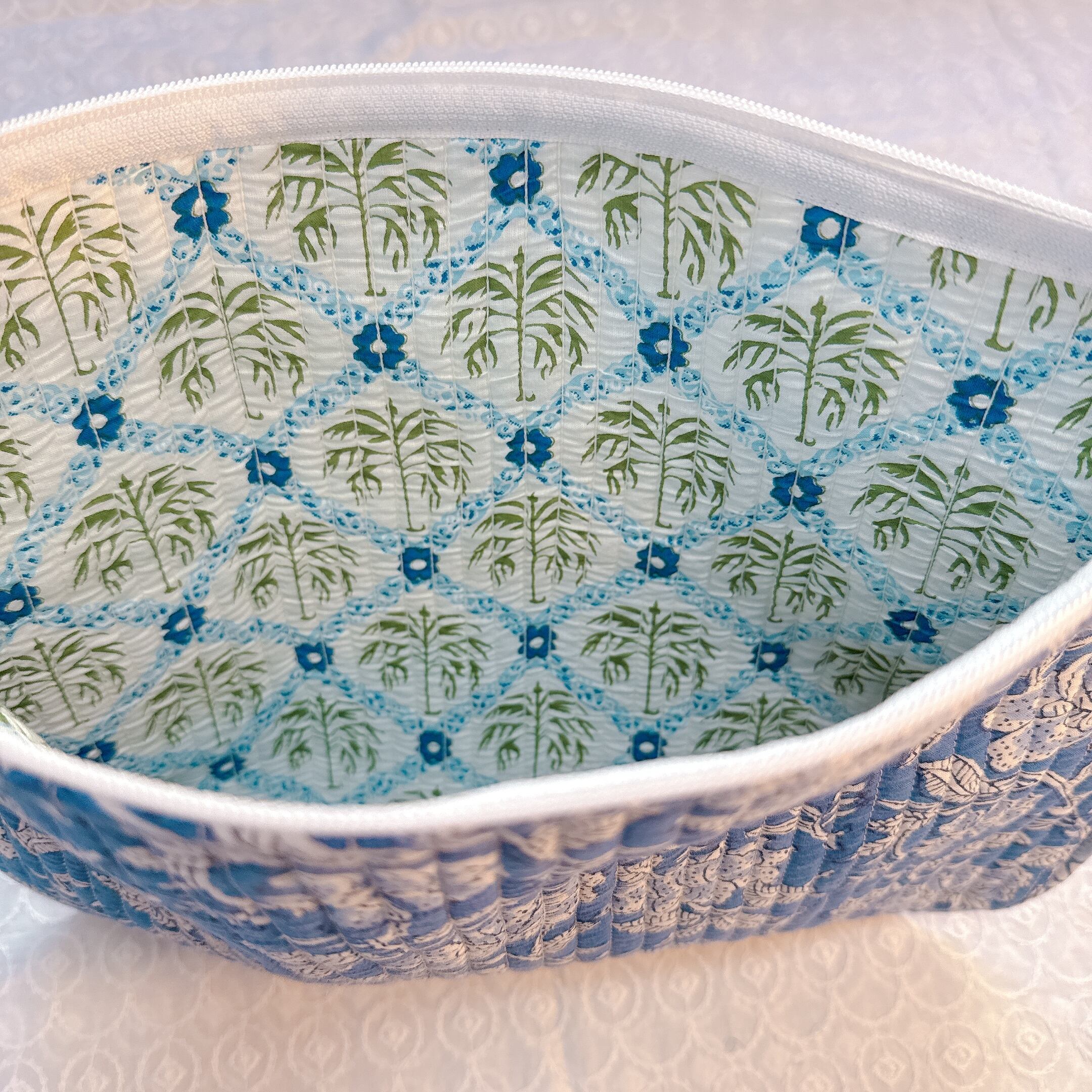 インド製のブロックプリントの為、インクのズレ・にじみがあったり、縫製時のマーキングが一部残っていたり、少々形が均一でない事もありますが、そこも一つの持ち味として楽しんでいただければ嬉しいです。