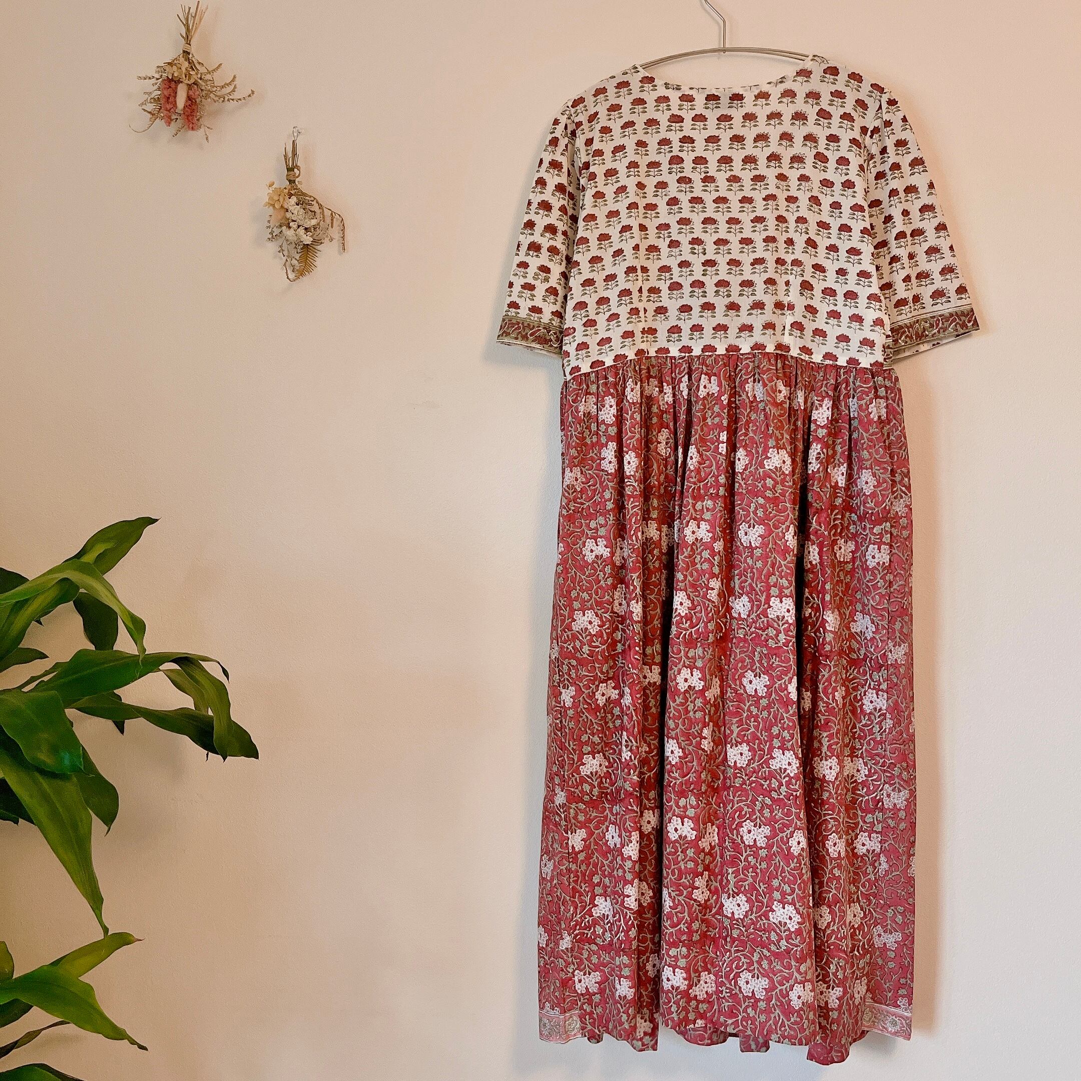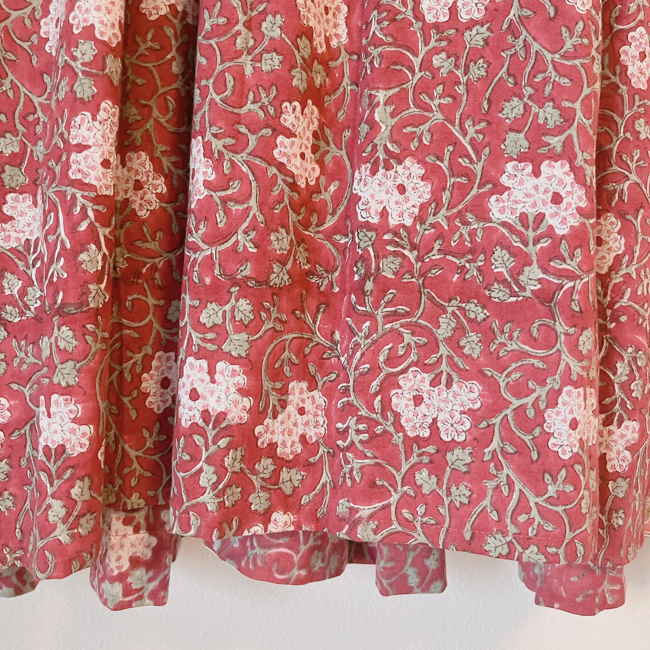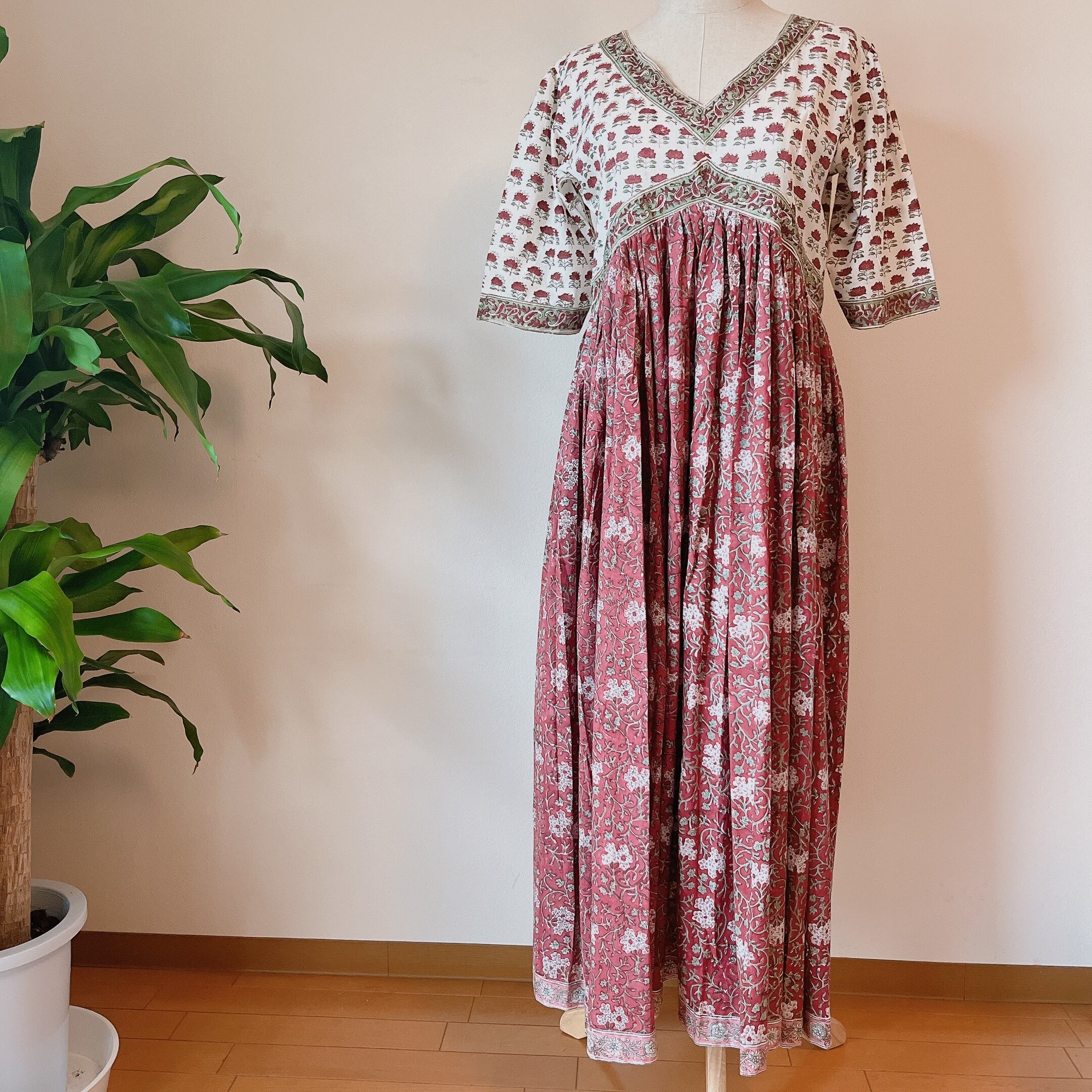 インド雑貨/インドの手仕事/インド好き/インド輸入/インドのワンピース/レッド/ブロックプリントワンピース/花柄/フラワープリント